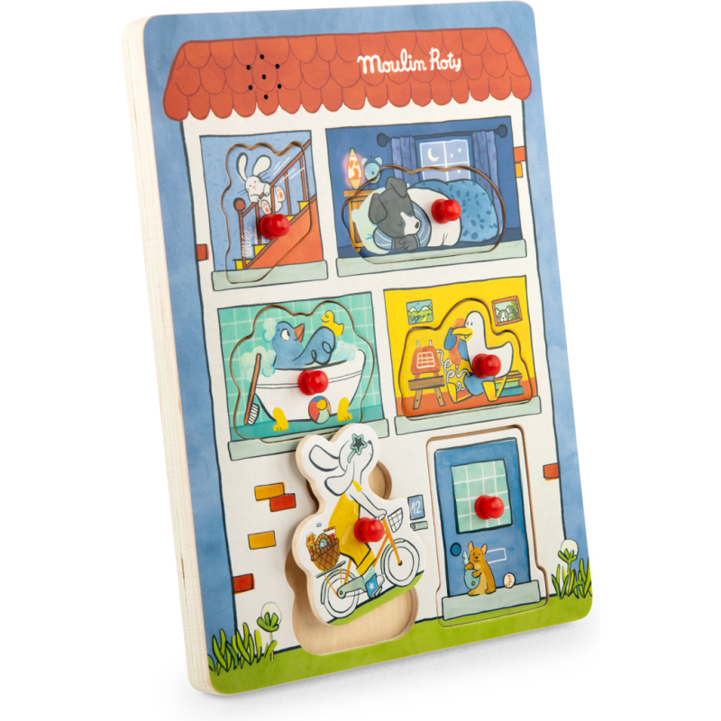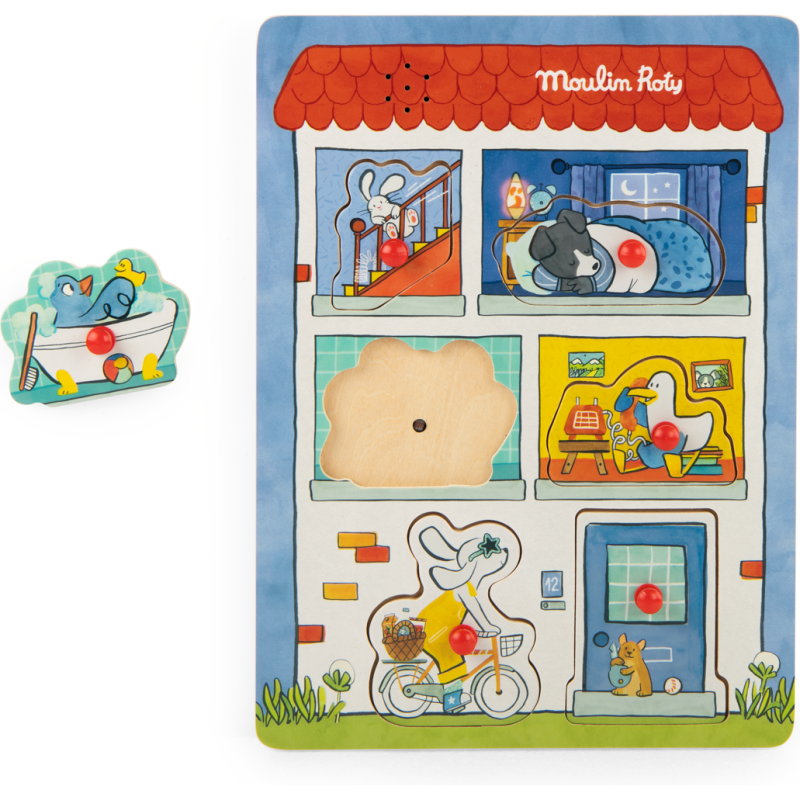 Puzzle sonore pour s'éveiller à la musique de manière ludique. Replace les 6 pièces en bois qui composent la maison de Puce & Pilou en y découvrant les sons du quotidien : sonnette, téléphone... Permet aussi d'appréhender les formes et les couleurs.