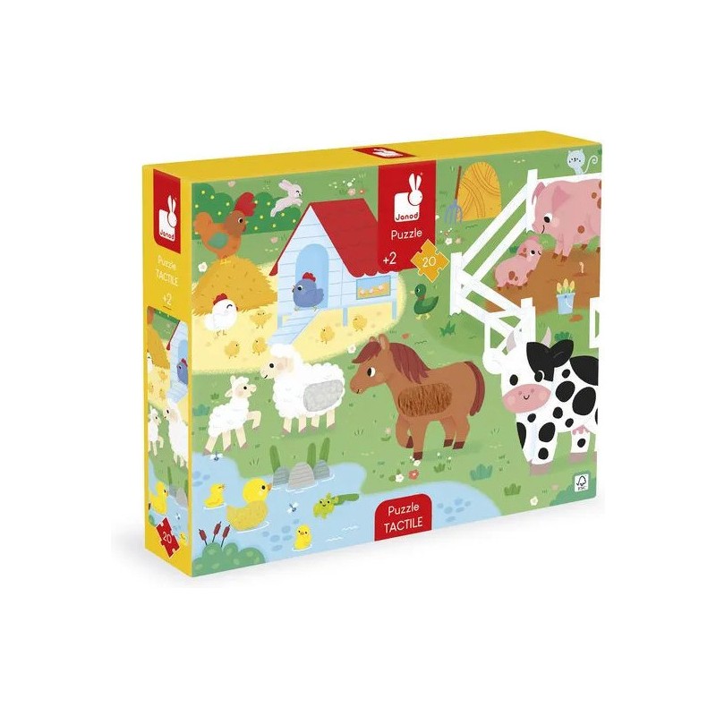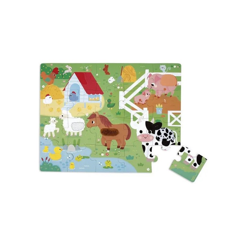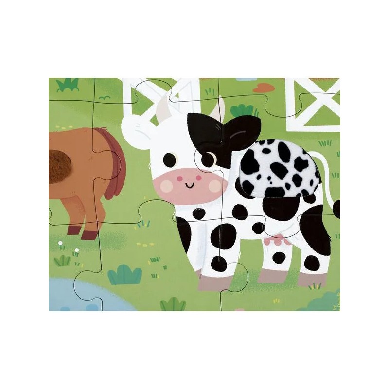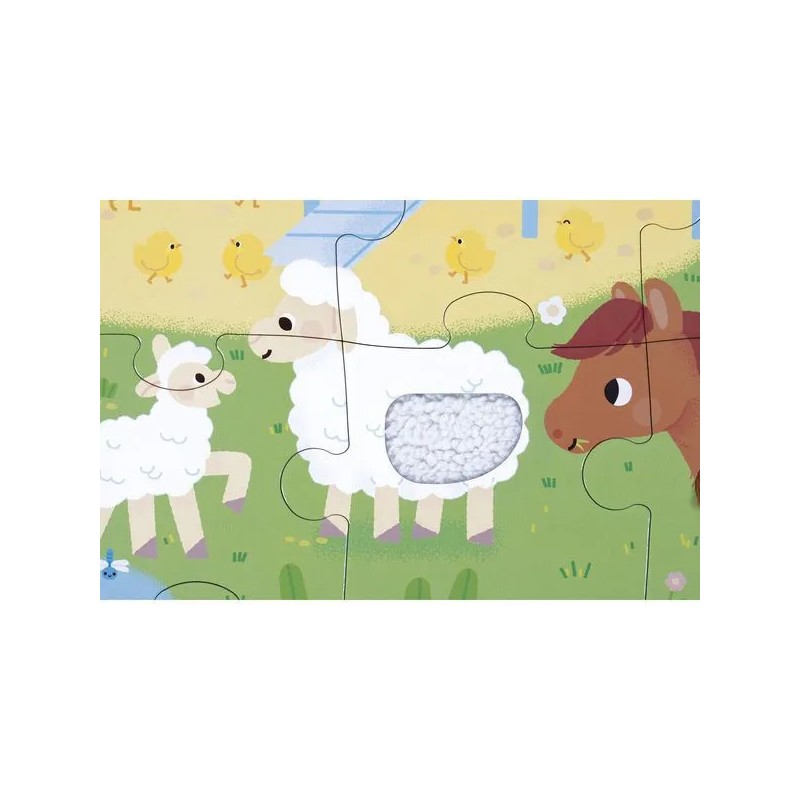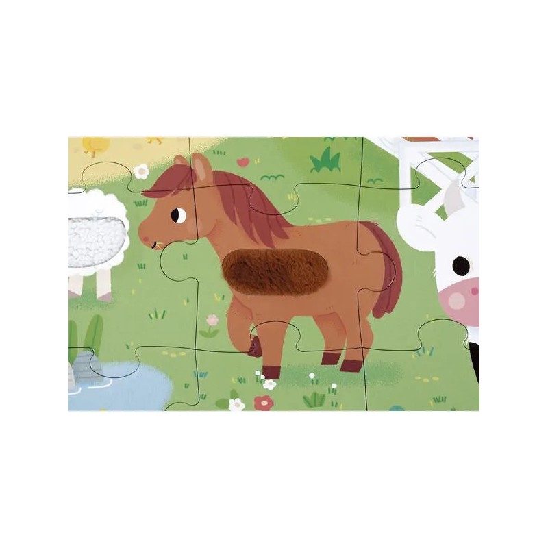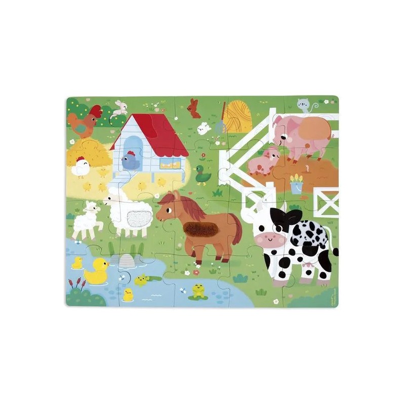 Les enfants vont adorer ce puzzle tactile géant sur le thème de la ferme. Après avoir réalisé un beau puzzle de 20 pièces, ils pourront découvrir différentes textures et matières un peu partout sur le puzzle et développeront ainsi leur sens du toucher et de l'observation. Pelage de vache et de mouton, queue du lapin, duvet du canard, crête du coq : de nombreuses imitations de textures sont à explorer du bout des doigts ! Livré avec un poster servant de modèle pour les petits débutants, ils pourront ensuite réaliser leur puzzle sans modèle lorsqu'ils gagneront en autonomie. Dans son format 65 x 50 cm, ce puzzle est composé de 20 pièces, dont 7 pièces texturées. Les puzzles sont fabriqués à partir de carton certifié Fsc™.