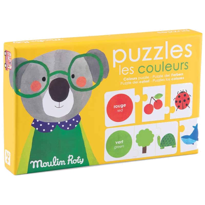 8 puzzles illustrés en carton épais, pour apprendre les couleurs de manière ludique, comprenant 3 pièces chacun. L'enfant doit associer à la couleur, l'animal et l'élément de la nature qui correspondent.