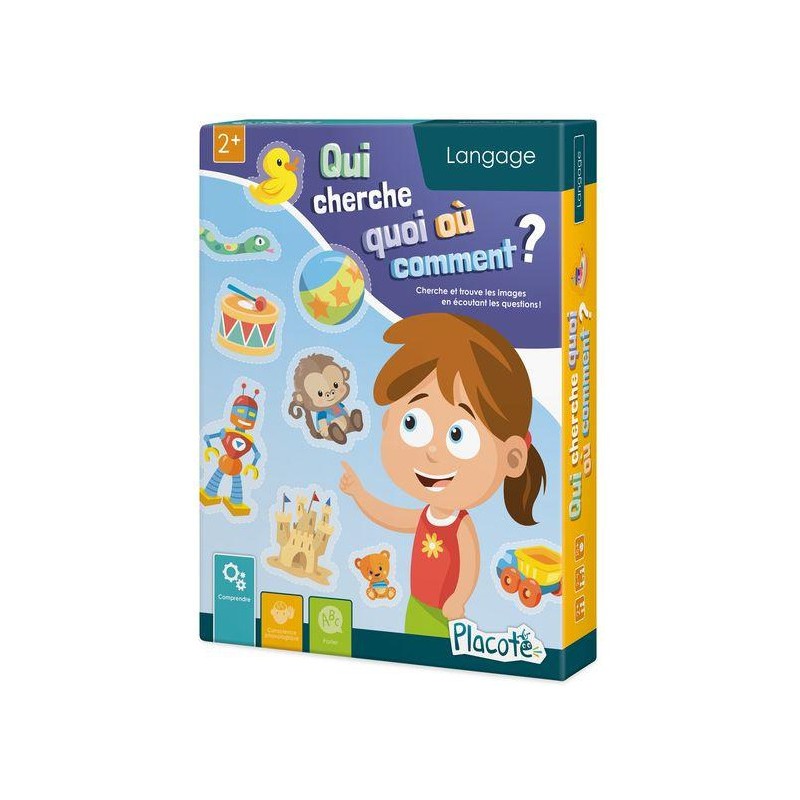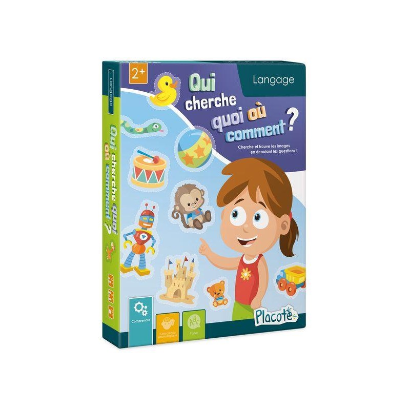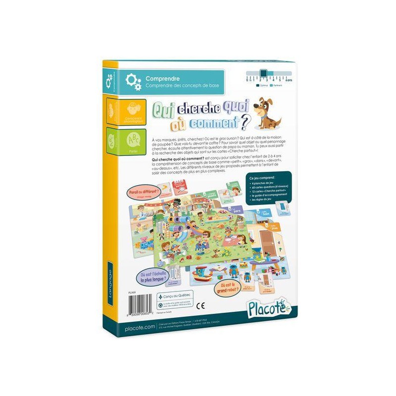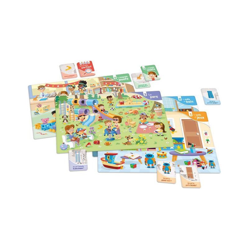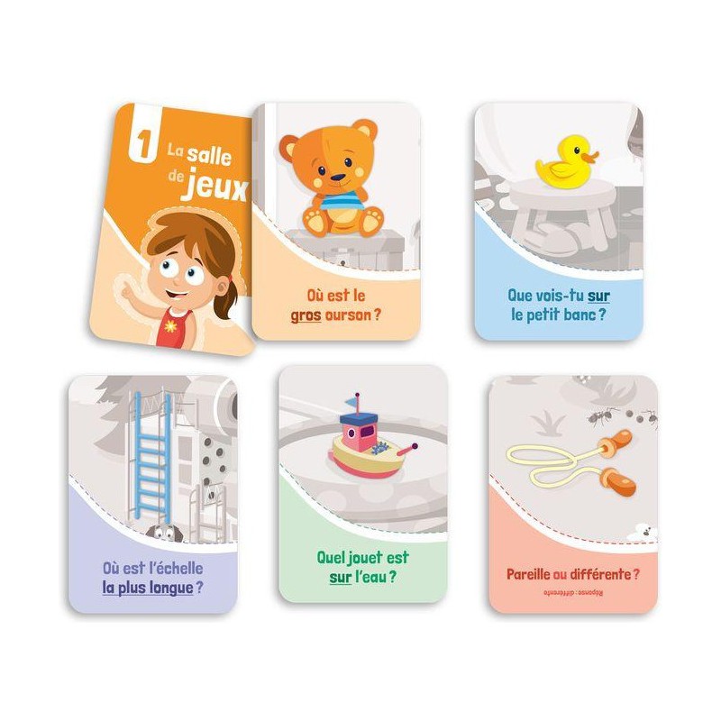 Jeu de type « cherche et trouve » dans lequel le joueur écoute une question posée par l’adulte pour savoir quel objet ou quel personnage chercher sur la planche de jeu. Les questions sollicitent la compréhension de concepts de base comme « petit », « gros », « dans », « devant », « au-dessus », etc. Les différents niveaux de jeu proposés permettent à l’enfant de saisir des concepts de plus en plus complexes. L’enfant peut aussi partir à la recherche des objets qui sont sur les cartes « Cherche partout ». Une fois l’élément trouvé, il doit observer les deux éléments (celui illustré sur la carte et celui illustré sur la planche) et dire s’ils sont pareils ou différents (« pareils ou pas pareils »).