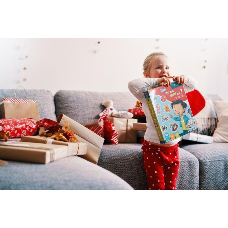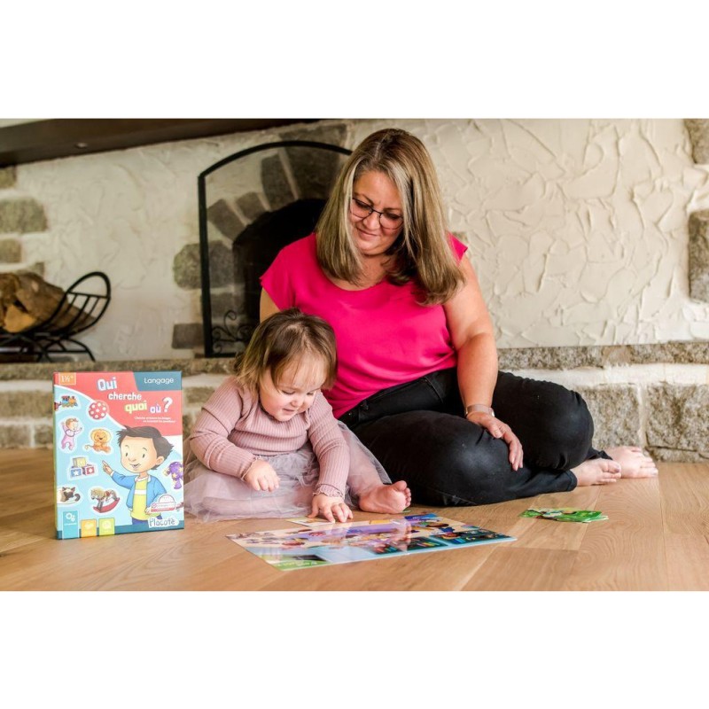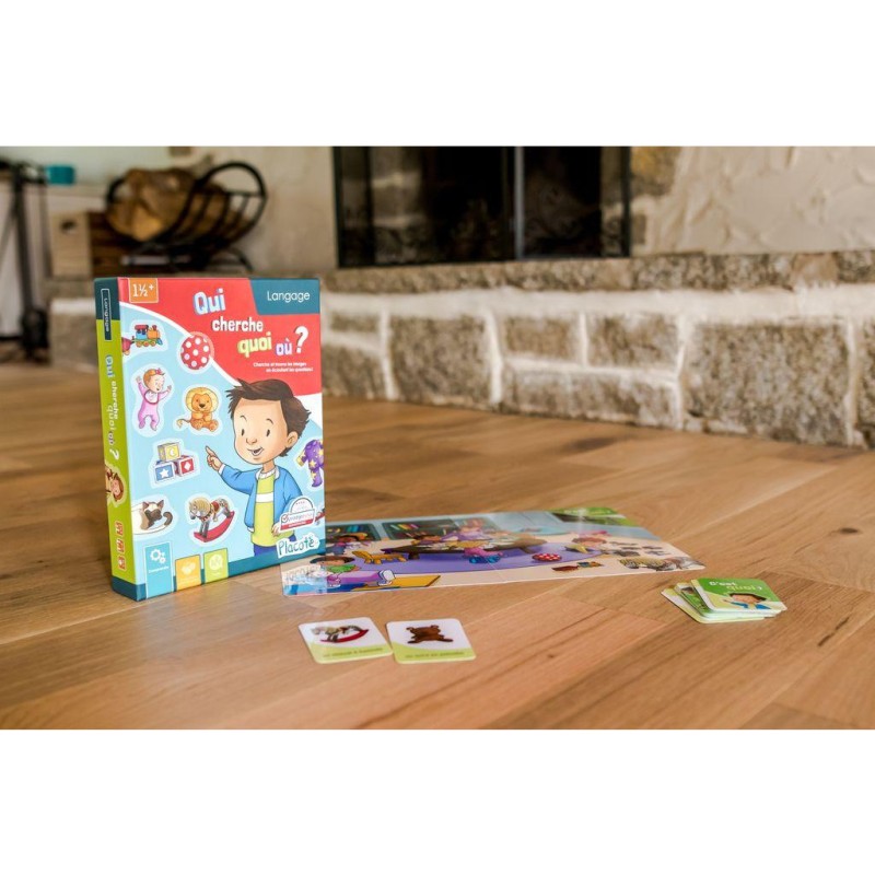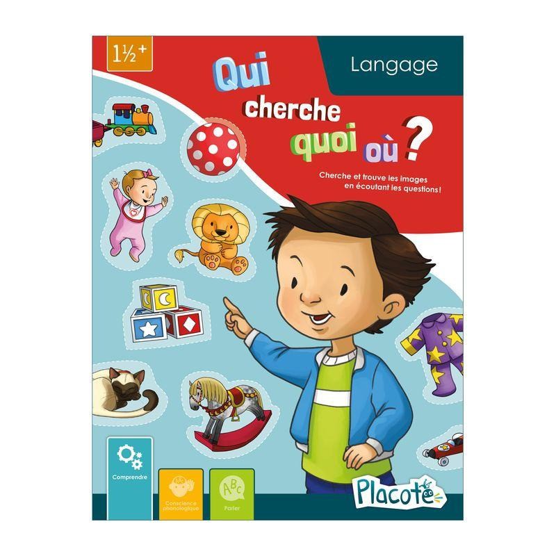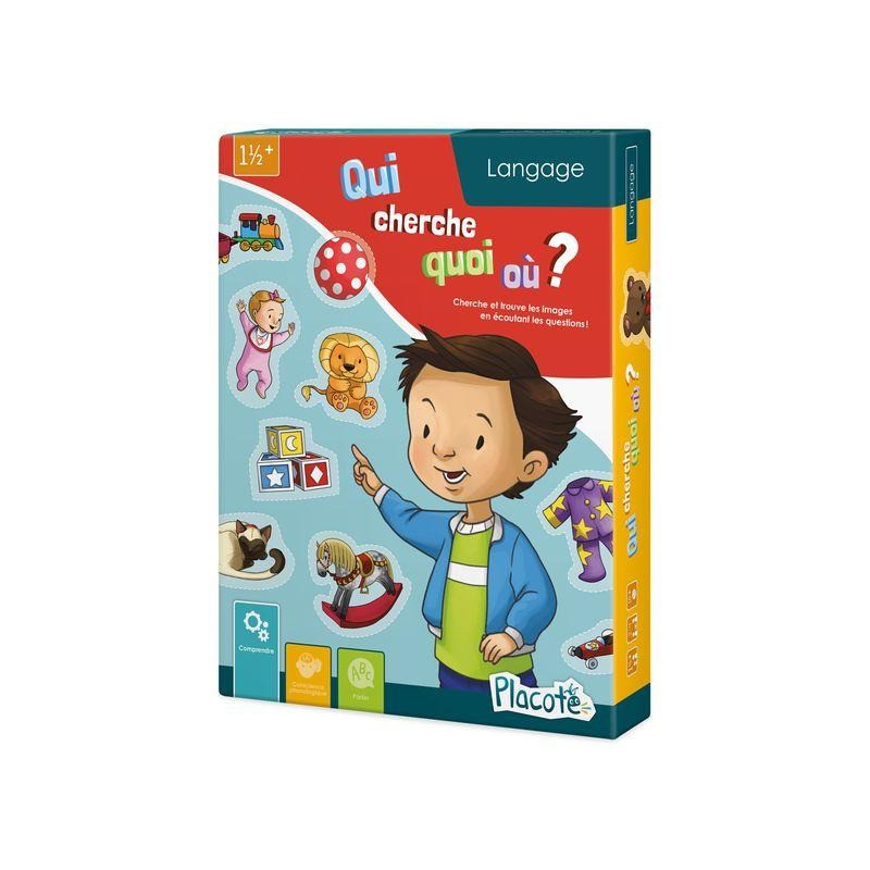 En répondant aux questions telles que « où est le chat ? », « que (quoi) fait le chien ? », ou «qui joue dans le jardin ?», les enfants de 1½ an à 3½ développeront leur capacité à comprendre les notions de localisation, d'action et d'identification. Le jeu favorise également le développement du vocabulaire, en enrichissant leur répertoire de mots et en les familiarisant avec les concepts de base. En plus de renforcer leur compréhension du langage, Qui cherche quoi où? encourage les enfants à exprimer leurs réponses de manière verbale, contribuant ainsi à développer leurs compétences en communication.