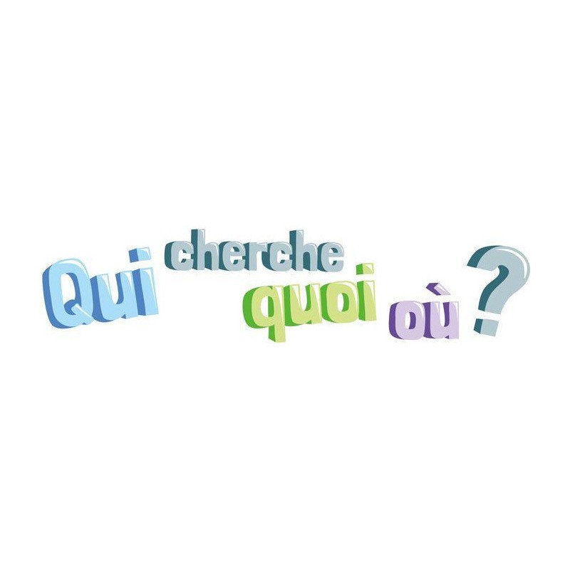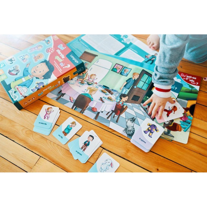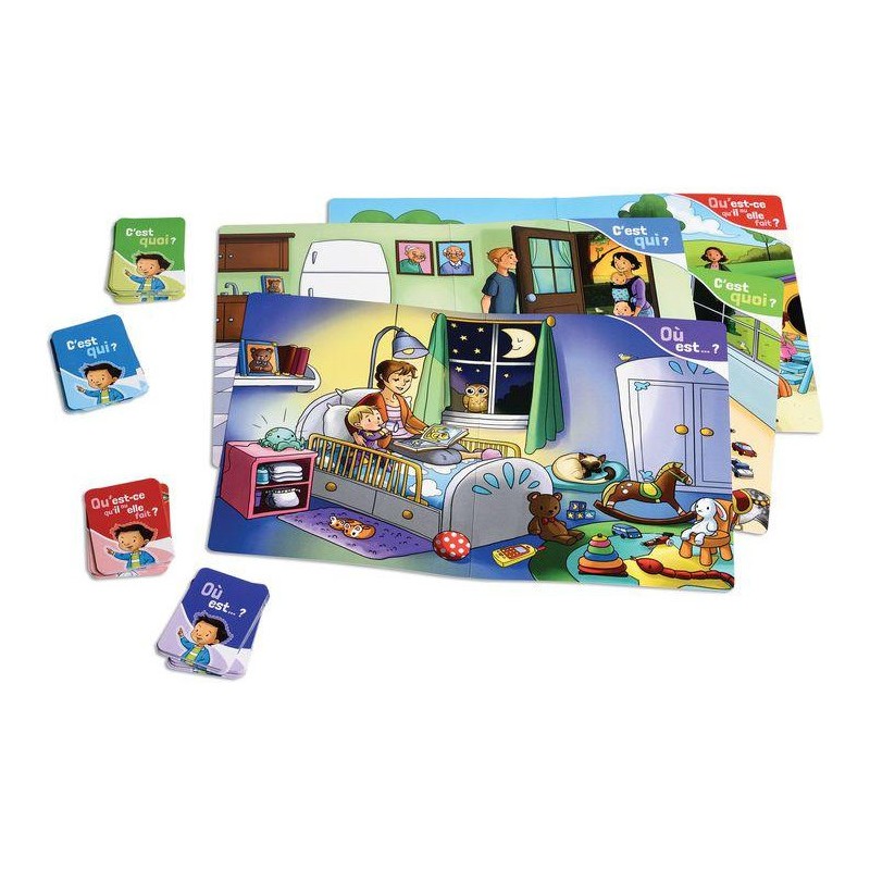 Jeu de cherche et trouve dans lequel l’enfant apprend à développer sa compréhension de questions simples. L’enfant et l’adulte choisissent une planche de jeu parmi les quatre planches disponibles. L’adulte prend ensuite les cartes-questions et les cartes « Cherche partout » associées à la planche choisie. L’enfant prend une première carte-question, l’adulte pose la question, l’enfant tente d’y répondre et cherche ensuite l’objet ou le personnage sur la planche de jeu. C’est ensuite au tour de l’adulte de jouer, et ainsi de suite. Lorsqu’un joueur prend une carte « Cherche partout », il cherche simplement l’objet sur la planche de jeu sans répondre à une question (ces objets se trouvent également sur les autres planches de jeu). La partie se termine quand tous les objets et les personnages représentés sur les cartes-questions ont été trouvés sur une planche de jeu.