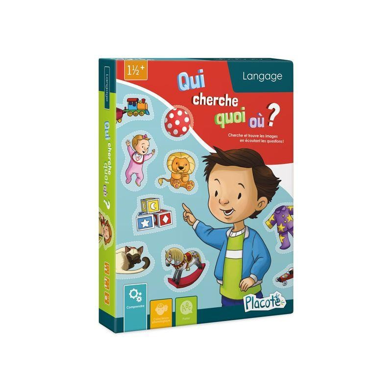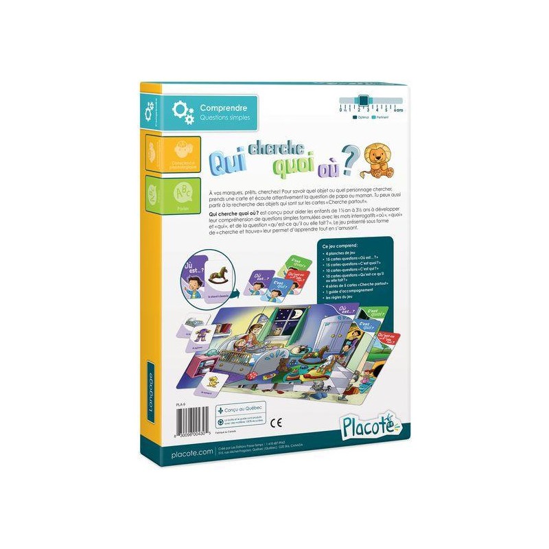 Qui cherche quoi où? est conçu pour aider les enfants de 1½ an à 3½ ans à développer leur compréhension de questions simples formulées avec les mots interrogatifs «où», «quoi» et «qui», et de la question «qu'est ce qu'il ou elle fait?». Le jeu est présenté sous forme de «cherche et trouve».