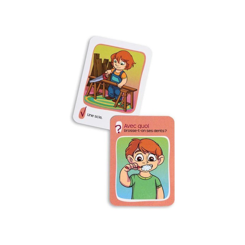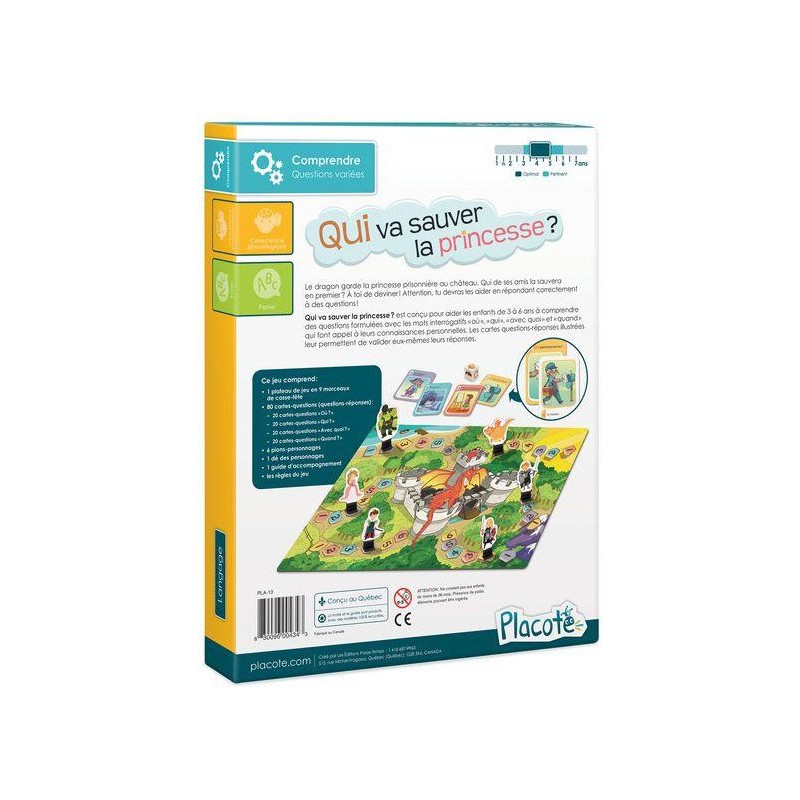 Qui va sauver la princesse? est conçu pour aider les enfants de 3 à 6 ans à comprendre des questions formulées avec les mots interrogatifs «où», «qui», «avec quoi» et «quand» qui font appel à leurs connaissances. Les cartes questions-réponses illustrées leur permettent de valider leurs réponses.