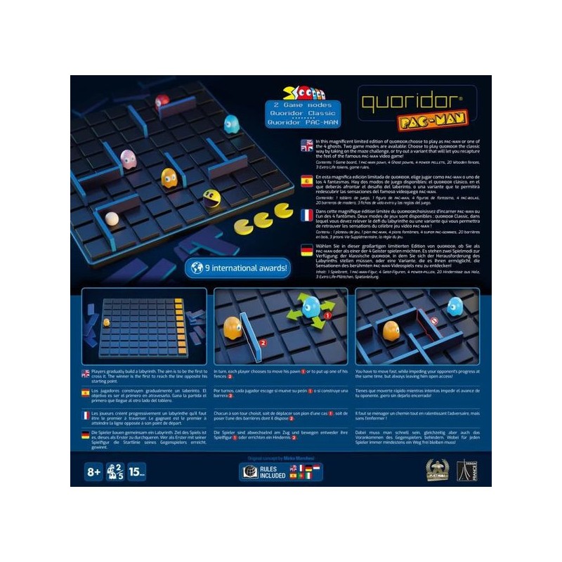 Dans cette magnifique édition limitée du Quoridor, choisissez d'incarner Pac-Man ou l'un des 4 fantômes. Deux modes de jeux sont disponibles : Quoridor classique, dans lequel vous devez relever le défi du labyrinthe ou une variante qui vous permettra de retrouver les sensations du célèbre jeu vidéo Pacman !