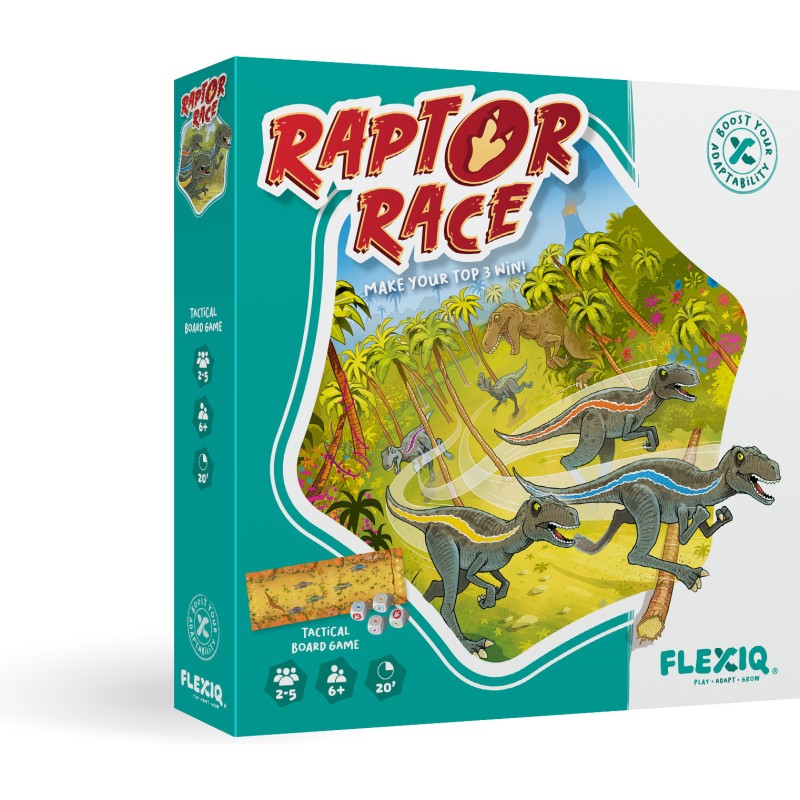 Raptor Race est un jeu de société de course jouable de 2 à 5 joueurs, dès 6 ans pour des parties d'environ 20 minutes, édité par Flexiq.