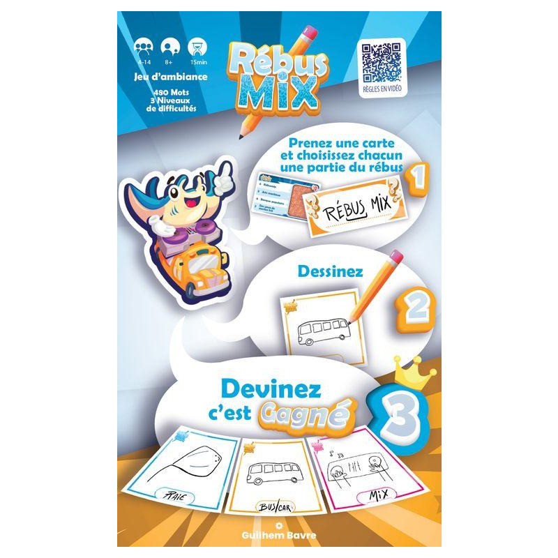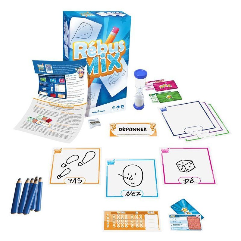 Rébus Mix est un jeu d'ambiance où les joueurs vont deviner des mots et expressions en réalisant des rébus de manière collective. A chaque tour, un joueur est désigné Rébulogue, il doit remettre dans l'ordre les dessins et deviner la signification du rébus réalisé par les autres joueurs.