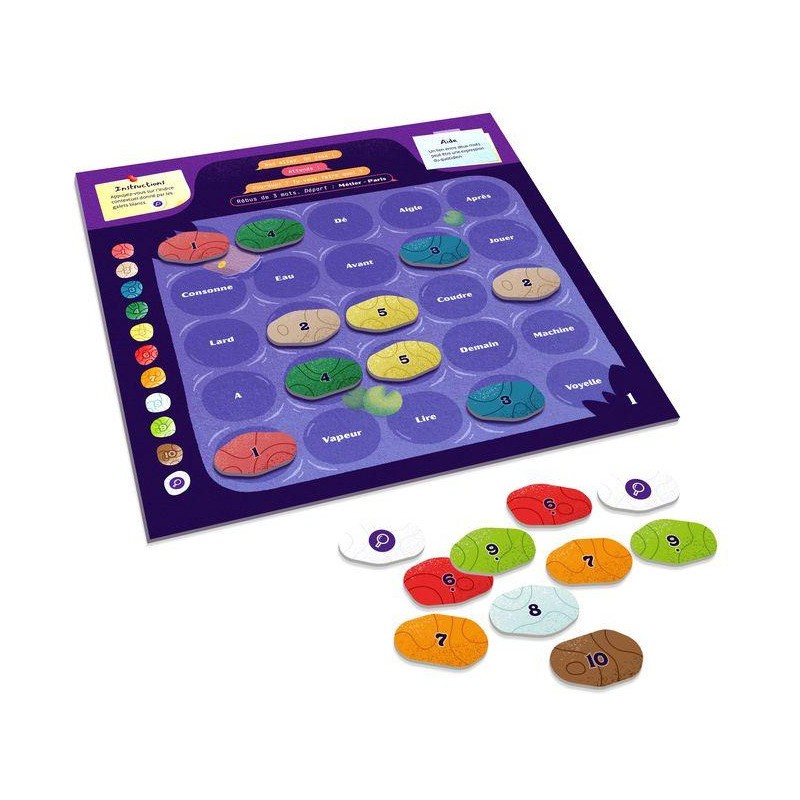 Contenu : 15 plateaux reco-verso présentant les 30 énigmes, 22 galets en carton, 1 règle