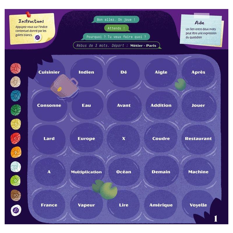 Rebondissez de mots en mots par association d'idées pour résoudre le rébus final ! Un jeu d'énigmes original, à jouer seul ou en collaborant, qui triture les neurones et développe les zygomatiques !
