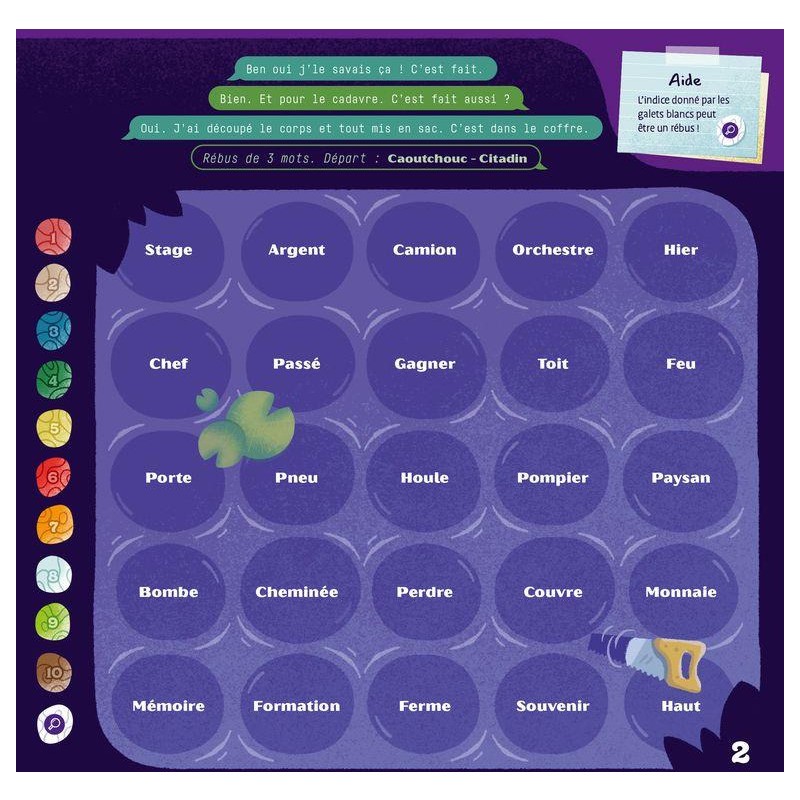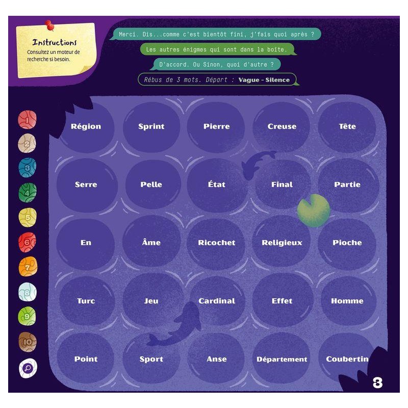 Suivez les aventures d’agents secrets loufoques dans une succession d’énigmes originales à résoudre seul ou à plusieurs. En utilisant les associations d’idées, faites des ricochets de mot en mot pour trouver le bon chemin et résoudre le rébus final ! 30 énigmes successives vous présentent l’aventure loufoque d’une équipe d’agents secrets. Chaque énigme est constituée d’un dialogue dont il faut découvrir la dernière phrase pour comprendre l’histoire, Pour la trouver, le ou les joueurs (en collaborant) doivent résoudre une grille de 25 mots dont la plupart doivent être cachés par des «galets». Pour les placer, les joueurs doivent trouver des couples de mots obligatoirement alignés. Chaque couple de mots amène par ricochet (association d’idées) au couple de mots suivant, jusqu’à ce que tous les galets soient posés. A la fin, les mots encore visibles (de 3 à 5) présentent un rébus drôle qui, une fois lu à haute voix dans le bon ordre, permet aux joueurs de découvrir une phrase ! La dernière du dialogue... Le contexte et des indices permettent aux joueurs de trouver le bon ordre. En cas d’erreur de parcours, ils doivent retourner en arrière ou recommencer, en regardant si besoin les réponses fournies.