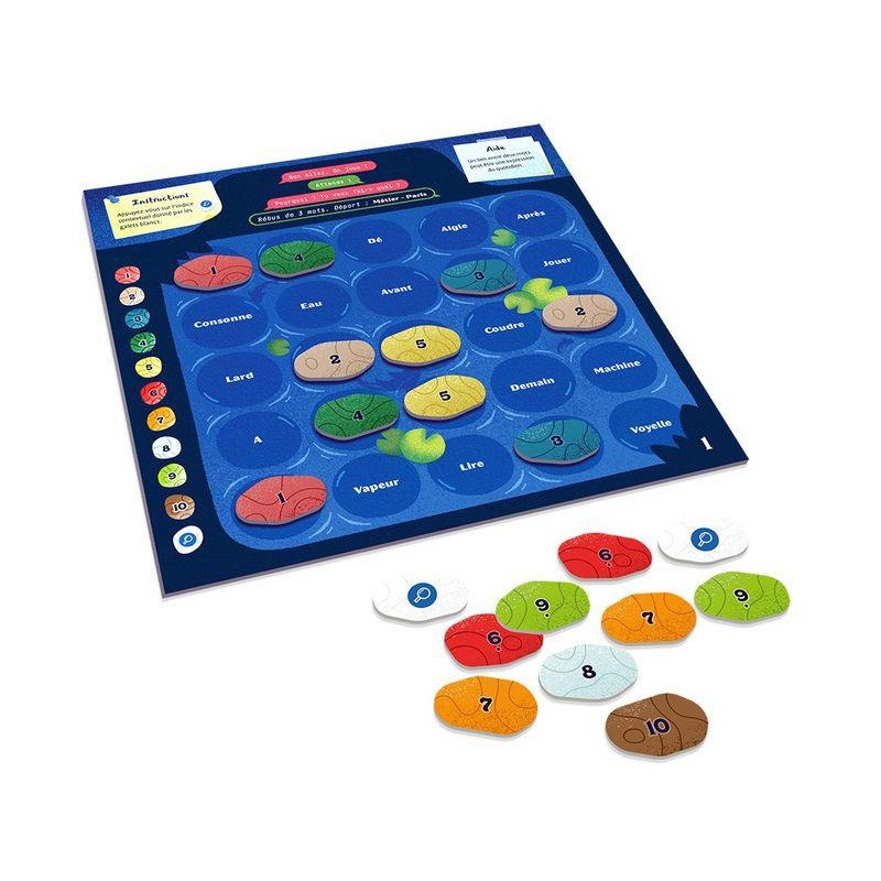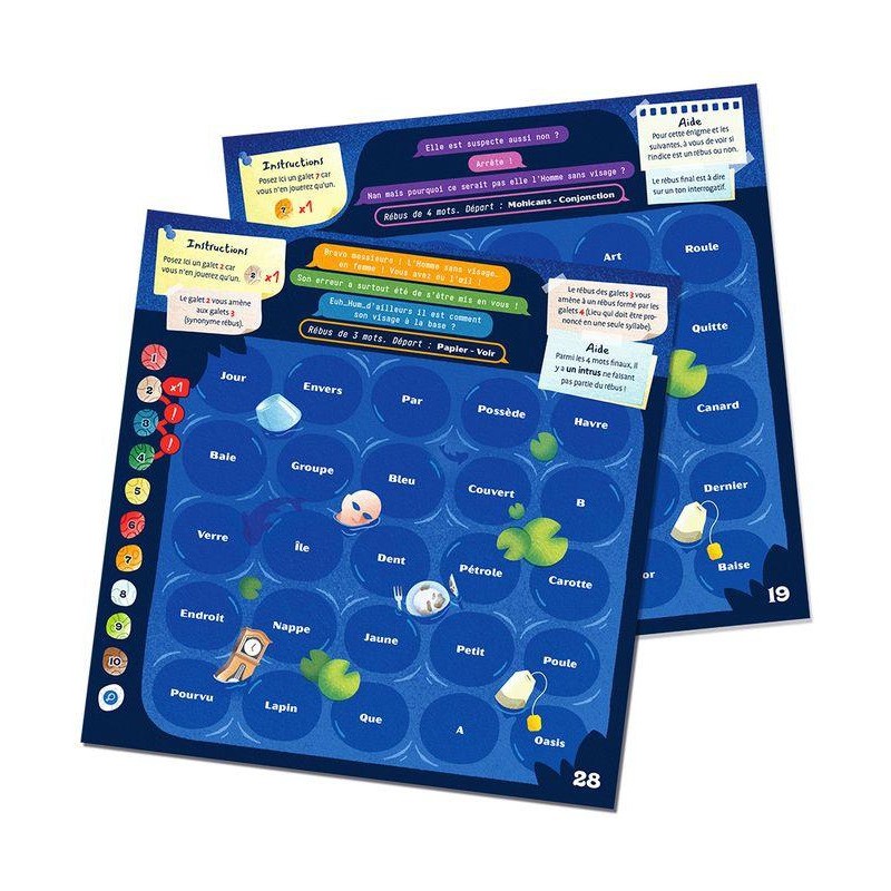 Contenu : 15 plateaux reco-verso présentant les 30 énigmes, 22 galets en carton, 1 règle,