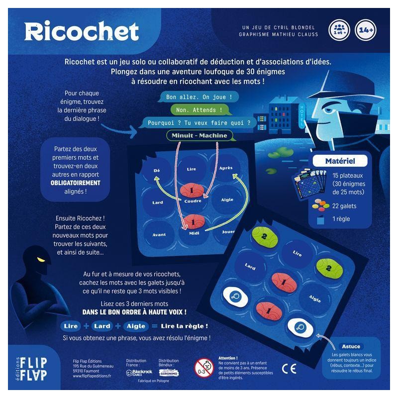 Dans le jeu passionnant Ricochet : Le profil de l'homme sans visage, vous allez plonger dans une aventure pleine de mystère et d'humour, où vous devrez jouer avec le sens et le son des mots pour résoudre des énigmes captivantes. En incarnant des agents secrets loufoques, votre mission sera de résoudre 30 énigmes successives qui vous mèneront à reconstituer un dialogue et à découvrir la dernière phrase qui éclairera toute l'histoire.