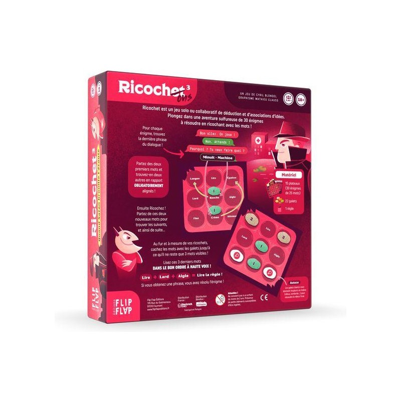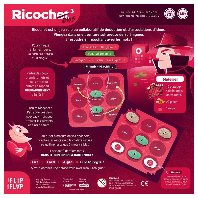 En solo, vous pourrez vous plonger dans une expérience immersive où votre esprit de déduction sera mis à l'épreuve. En équipe, vous pourrez collaborer, partager des idées et vous entraider pour venir à bout des défis les plus ardus.Ricochons est le troisième volet de la série Ricochet signée Cyril Blondel et celui-ci en plus de mêler humour et bons jeux de mots, dispose d'une inspiration coquine qui donne chaud !