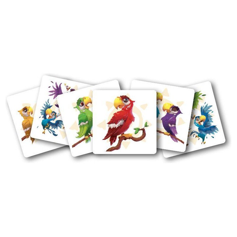 Les mots prononcés dépendent de la carte visible de la défausse. Les perroquets sages vous feront rimer et les perroquets fous vous feront dire n’importe quoi ! Et découvrez plus tard, les arbres à palabres qui vous imposeront d’autres contraintes...