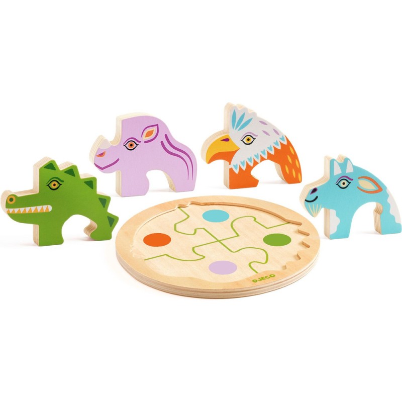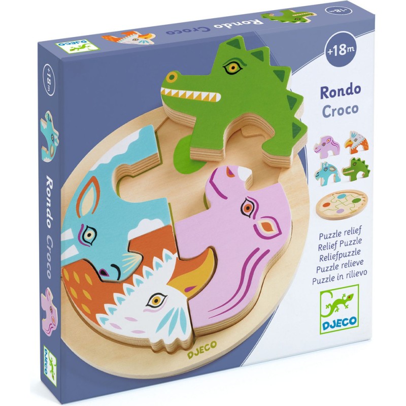 Rondo Croco est un puzzle en bois facile à assembler sur le thème des animaux. Les quatre animaux forment une ronde, et l’enfant les place en suivant la découpe extérieure et les traits au sol, développant ainsi sa perception des formes et sa coordination.