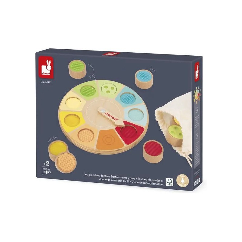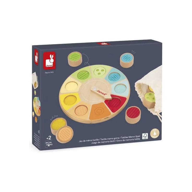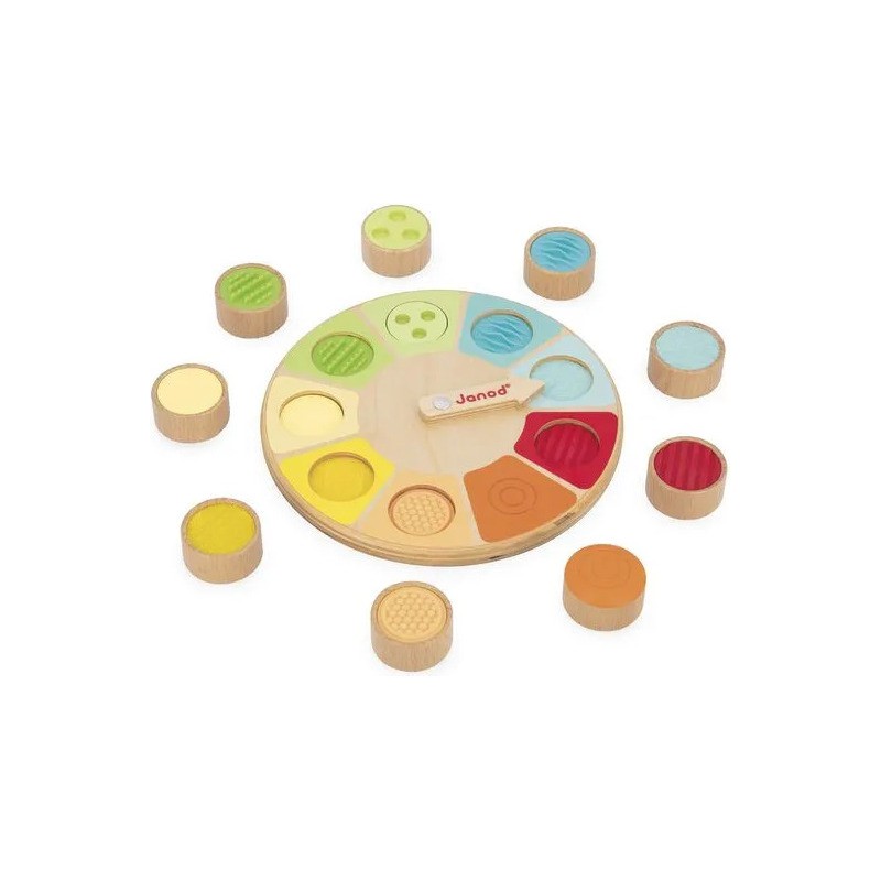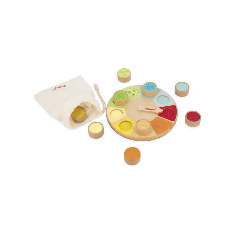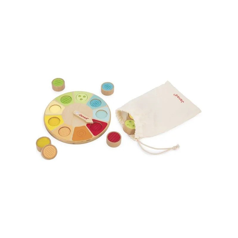 Deviner juste avec les doigts ! Voici une roue sensorielle qui va permettre aux enfants dès 2 ans de développer leurs sens et notamment le toucher. Le principe est simple : une fois la flèche lancée, l’enfant doit plonger sa main dans le sac en coton et retrouver, par le toucher, la pièce qui correspond à la texture indiquée sur le plateau ! Le jeu comprend 9 pièces en bois avec des textures et matières variées : feutrine, scratch, bois, silicone, surface lisse ou à reliefs. Chaque texture est reprise sur le plateau pour faciliter l’association. Ce jeu de reconnaissance tactile fait appel au toucher mais aussi à la mémoire sensorielle. Les couleurs douces et contrastées différencient chaque texture pour stimuler l’attention visuelle des tout-petits. Elles permettent de mieux repérer les pièces, tout en créant un univers ludique. Ce jouet d'éveil est composé de bois certifié Fsc™. Les mains dans le sac, c’est parti !