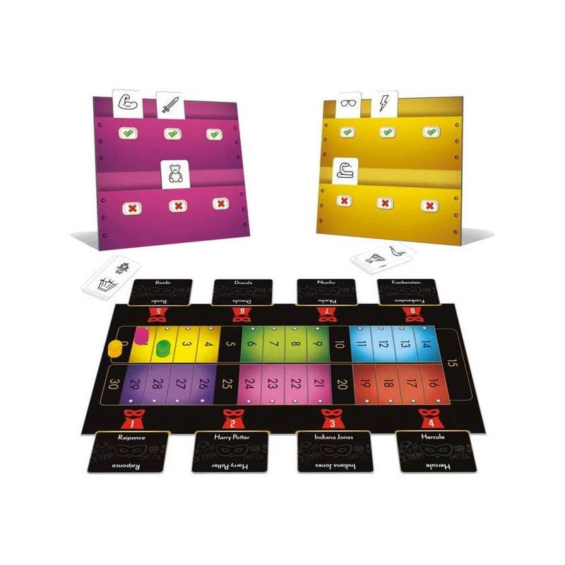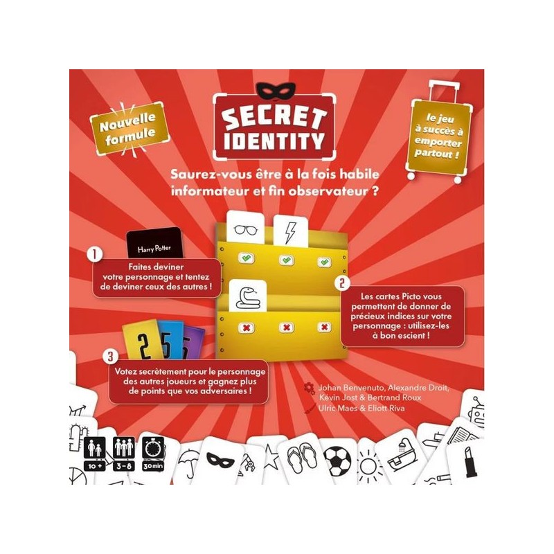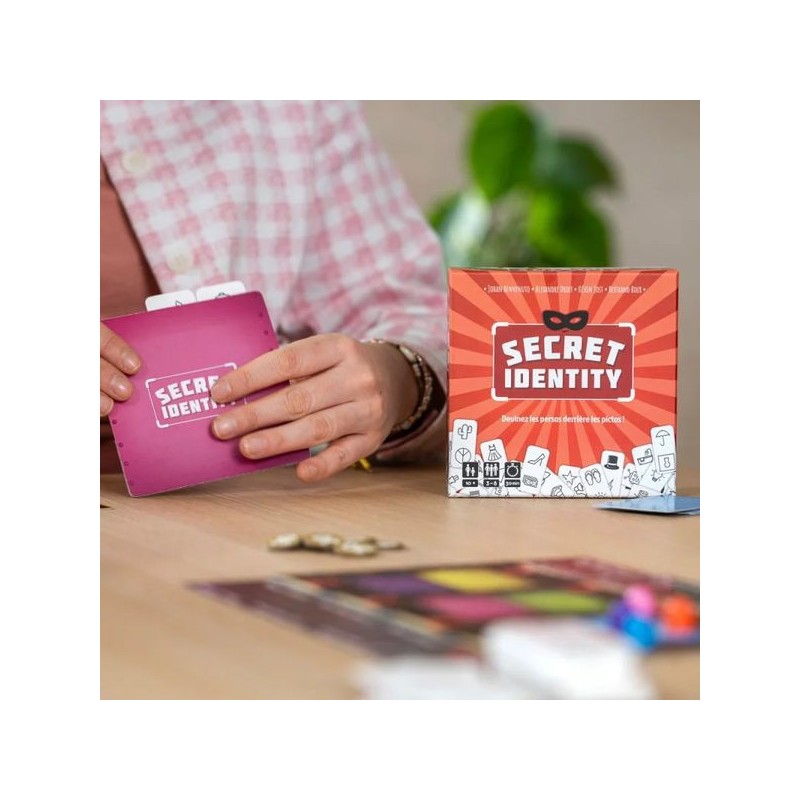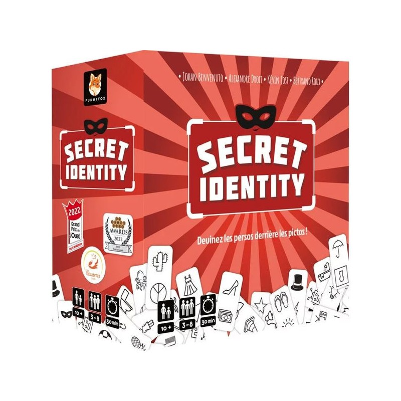 Dans Secret Identity, vous vous verrez attribuer une clé Mystère désignant une carte Personnage parmi les 8 disposées au centre de la table. À l’aide de vos cartes Picto, vous devrez faire deviner votre carte Personnage aux autres joueurs, tout en essayant de deviner la leur, pour gagner un maximum de points de victoire. À chaque manche, de nouveaux personnages seront tirées, mais vos cartes Picto ne seront pas remplacées ! À vous de faire les bons choix et de mesurer les risques… À la fin de la 4e manche, le joueur avec le plus de points de victoire remporte la partie !