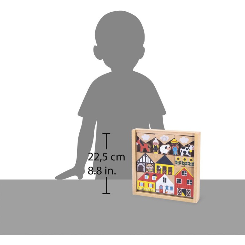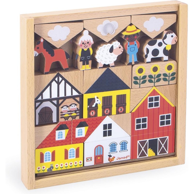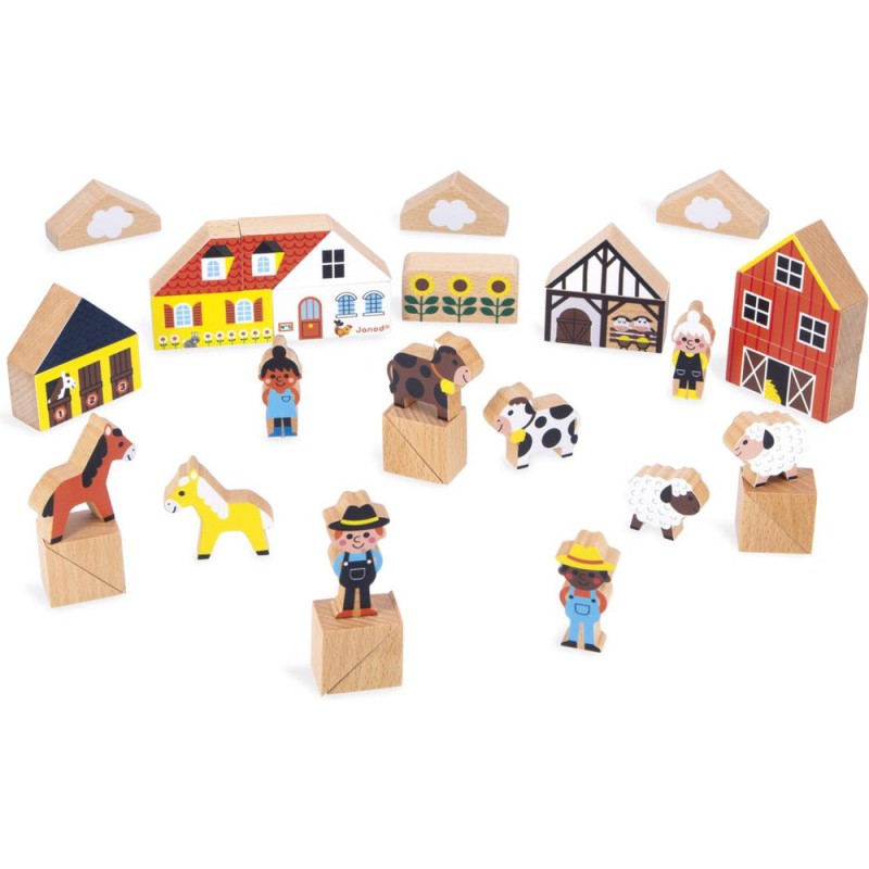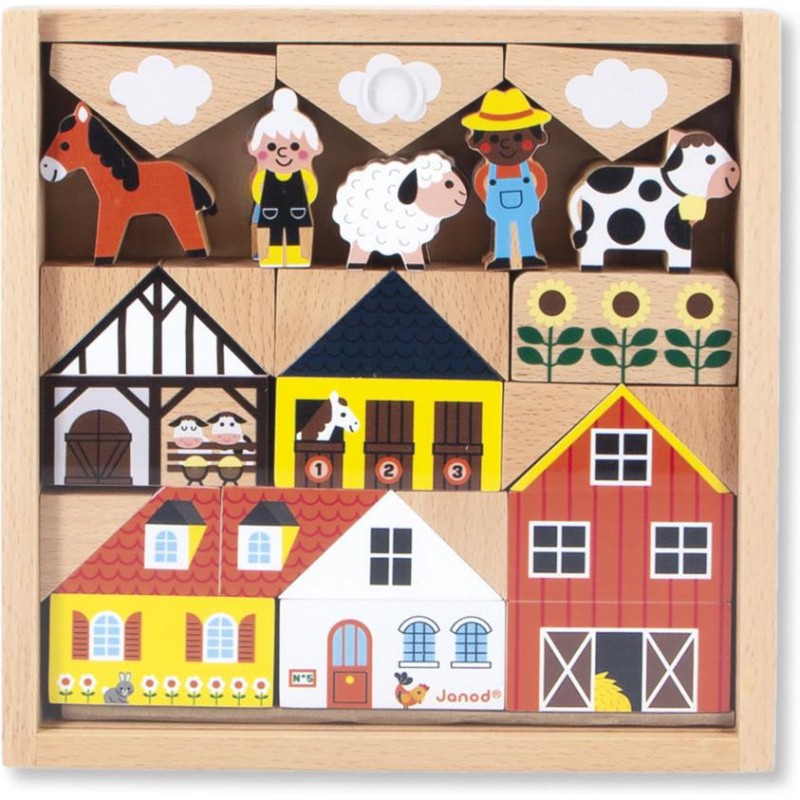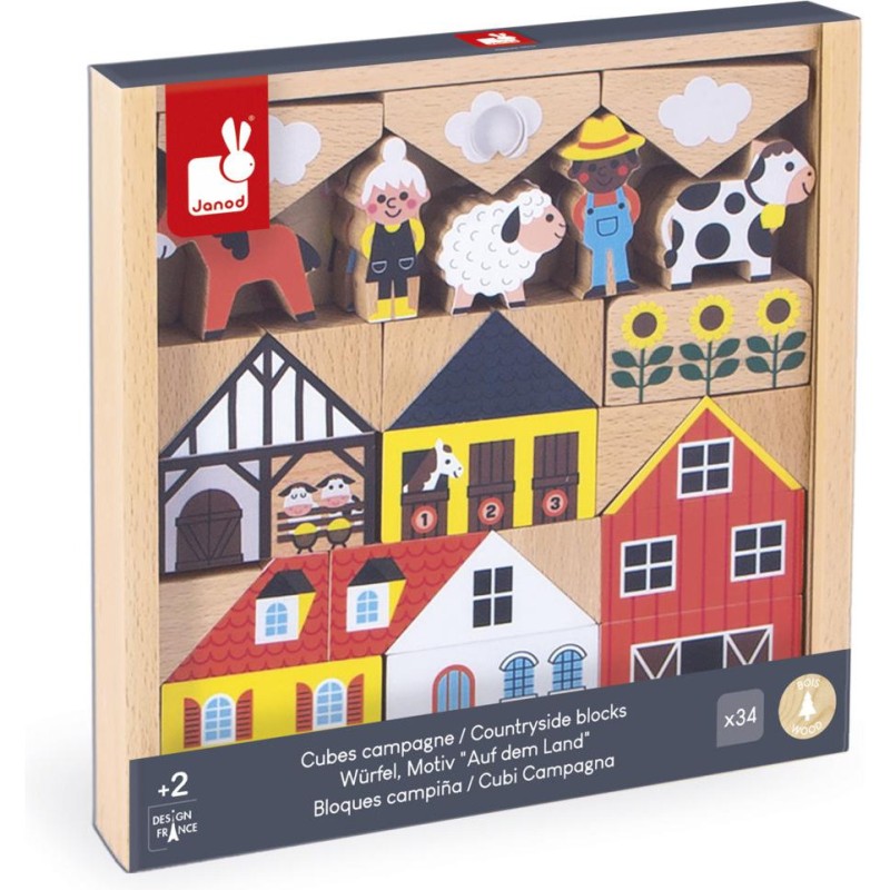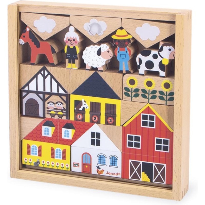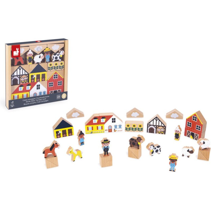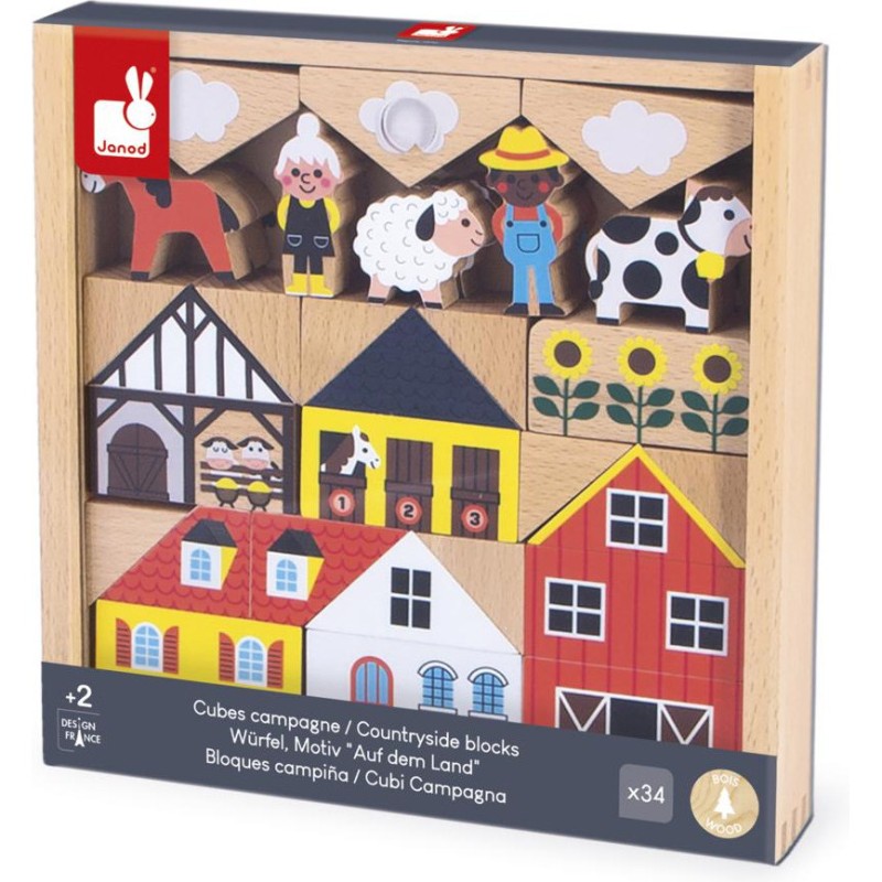 Construisez la ferme de notre duo d’agriculteurs ! Grâce à ce set de cubes et personnages en bois, les enfants construisent une ferme avec tous les abris pour les animaux, dès l’âge de 2 ans. Composé de 34 éléments en bois massif au total, ce jeu de construction contient : 20 cubes pour assembler la ferme et ses environs, 4 éléments de décor, et 10 personnages et animaux. Toute la ferme est prête à s’animer ! Avec leurs cubes en bois, les enfants développent leur créativité et leur imagination, mais aussi leur dextérité. Les plus petits adorent empiler à l’infini, tandis que les grands s’inventent leurs propres univers. De drôles d’histoires et de folles aventures vont avoir lieu dans cette ferme en effervescence ! Astucieux, l’emplacement des cubes est imprimé au fond de leur boîte de rangement : il n’y a plus qu’à suivre le modèle pour tout agencer à la manière d’un puzzle, et faire coulisser le couvercle transparent pour admirer le résultat. Effet Waouh garanti au moment de l’ouverture du jeu ! Ce set de cubes et personnages Campagne est issu de notre collection Cross Roads : une série de tapis de jeu avec circuits, encore plus ludiques quand ils sont complétés par nos assortiments de cubes et nos petits véhicules en bois. Ce set convient particulièrement au tapis de jeu Campagne, mais s’associe tout aussi bien avec d’autres tapis de la gamme. Il est composé de bois issu de forêts gérées durablement, certifié Fsc™. Alors vite, tous à la grange !