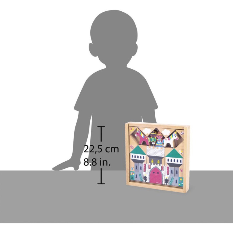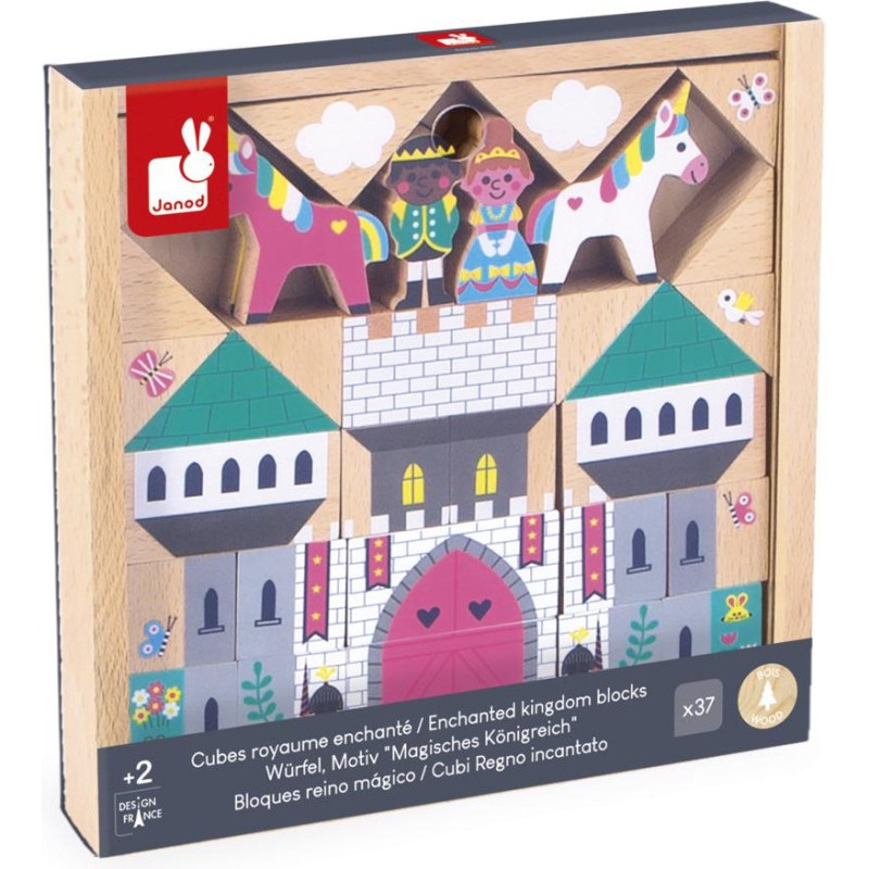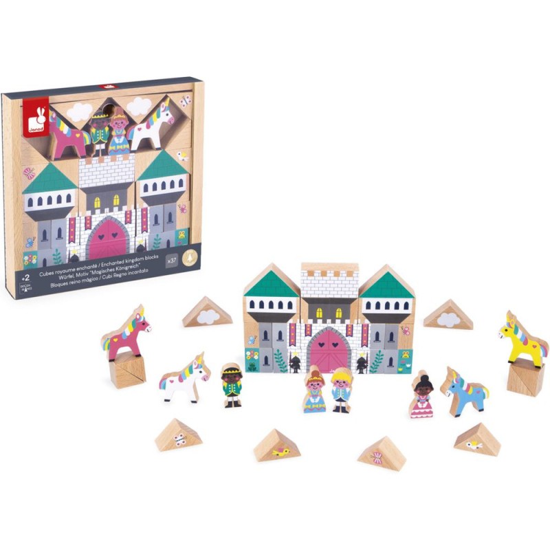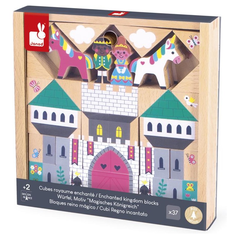 La construction du château peut commencer ! Grâce à ce set de cubes et personnages en bois, les enfants construisent leur propre Royaume Enchanté, dès l’âge de 2 ans. Composé de 37 éléments en bois massif au total, ce jeu de construction contient : 29 cubes pour assembler le château-fort et décorer les environs, 4 personnages, et 4 licornes. Donnez vie au plus beau des châteaux dès maintenant ! Avec leurs cubes en bois, les enfants développent leur créativité et leur imagination, mais aussi leur dextérité. Les plus petits adorent empiler à l’infini, tandis que les grands s’inventent leurs propres univers. De drôles d’histoires et de folles aventures vont avoir lieu dans ce royaume peuplé de créatures fantastiques ! Astucieux, l’emplacement des cubes est imprimé au fond de leur boîte de rangement : il n’y a plus qu’à suivre le modèle pour tout agencer à la manière d’un puzzle, et faire coulisser le couvercle transparent pour admirer le résultat. Effet Waouh garanti au moment de l’ouverture du jeu ! Ce set de cubes et personnages Royaume Enchanté est issu de notre collection Cross Roads : une série de tapis de jeu avec circuits, encore plus ludiques quand ils sont complétés par nos assortiments de cubes et nos petits véhicules en bois. Ce set convient particulièrement au tapis de jeu Royaume Enchanté, mais s’associe tout aussi bien avec d’autres tapis de la gamme. Il est composé de bois issu de forêts gérées durablement, certifié Fsc™. Alors vite, tous au château !