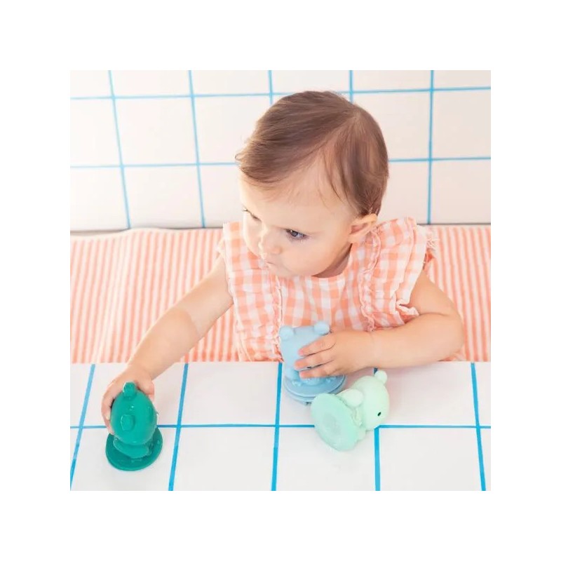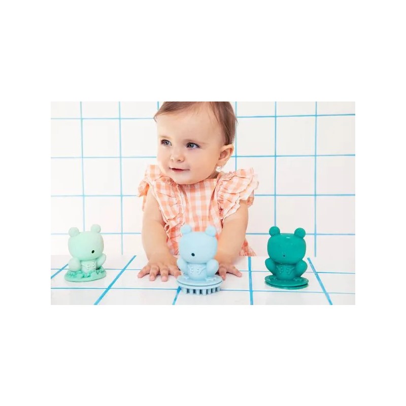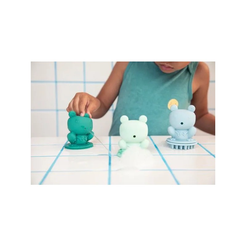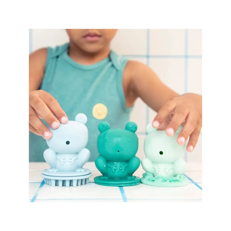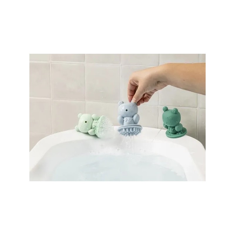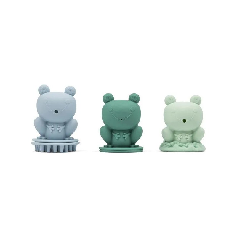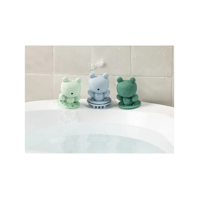 Un trio rigolo pour des éclats de rire garantis ! Avec ce set de 3 grenouilles en silicone adaptées aux bébés dès 9 mois, le bain devient un véritable moment de jeu et de découvertes. Trois grenouilles, trois activités pour éveiller les sens de l'enfant et lui donner envie de jouer avec l’eau ! Ce trio pour le bain encourage votre tout-petit à explorer, toucher et interagir avec l’eau. Plouf ! Les grenouilles rigolotes ont sauté dans le bain… Prêtes à jouer avec bébé ! Découvrez leurs surprises ! La grenouille bleue, avec ses picots tout doux, invite à des massages amusants. Elle adore prendre soin de bébé et transformer le bain en moment super relax ! Et surprise : ses petits trous, situés en-dessous, laissent filer l’eau comme une pluie légère, pour éveiller encore plus les sens des tout-petits ! Si la bleue adore la détente, la grenouille vert foncé, elle, préfère mettre de l’ambiance ! Toujours prête à éclabousser, elle projette des jets d'eau lorsqu'on appuie sur sa tête après l'avoir remplie. La dernière, de couleur vert clair, surprend les petits curieux : on met un peu de savon sur son tissu, on souffle… et de la mousse apparaît ! En manipulant les grenouilles, l’enfant stimule sa motricité fine et découvre que ses gestes ont des effets : il appuie, il souffle, il verse… et le bain s’anime ! Ce jouet de bain stimule également l’imagination en invitant l’enfant à inventer tout plein d'histoires, créer des scénarios et transformer chaque bain en aventure. Grâce à leurs différentes fonctionnalités, ces grenouilles encouragent la curiosité et le jeu libre, pour des moments de détente qui deviennent de véritables explorations. Et pour les parents, un vrai plus : les grenouilles sont faciles à laver et à entretenir. Il suffit de les rincer après usage et de les laisser sécher. Hop, tout le monde à l’eau !