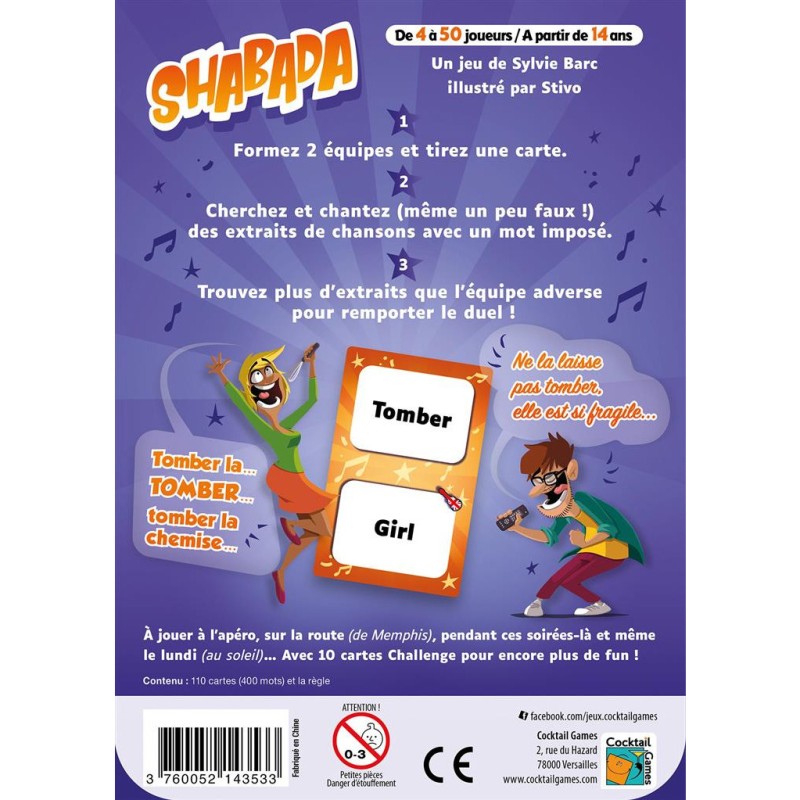 Une battle en chansons ! Shabada est le plus célèbre des jeux de chansons : il fait chanter des familles et des bandes d’amis depuis des années ! Voici une nouvelle édition, dépoussiérée et plus dynamique, au look coloré.
