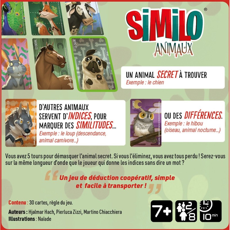 Vous avez 5 tours pour démasquer l'animal secret. Si vous l’éliminez par erreur vous avez tous perdu ! Serez-vous sur la même longueur d’onde que le joueur qui donne les indices sans dire un mot ? Similo Animaux est un jeu de déduction coopératif dans lequel les joueurs doivent retrouver l'animal secret du narrateur à l'aide d'autres animaux.
