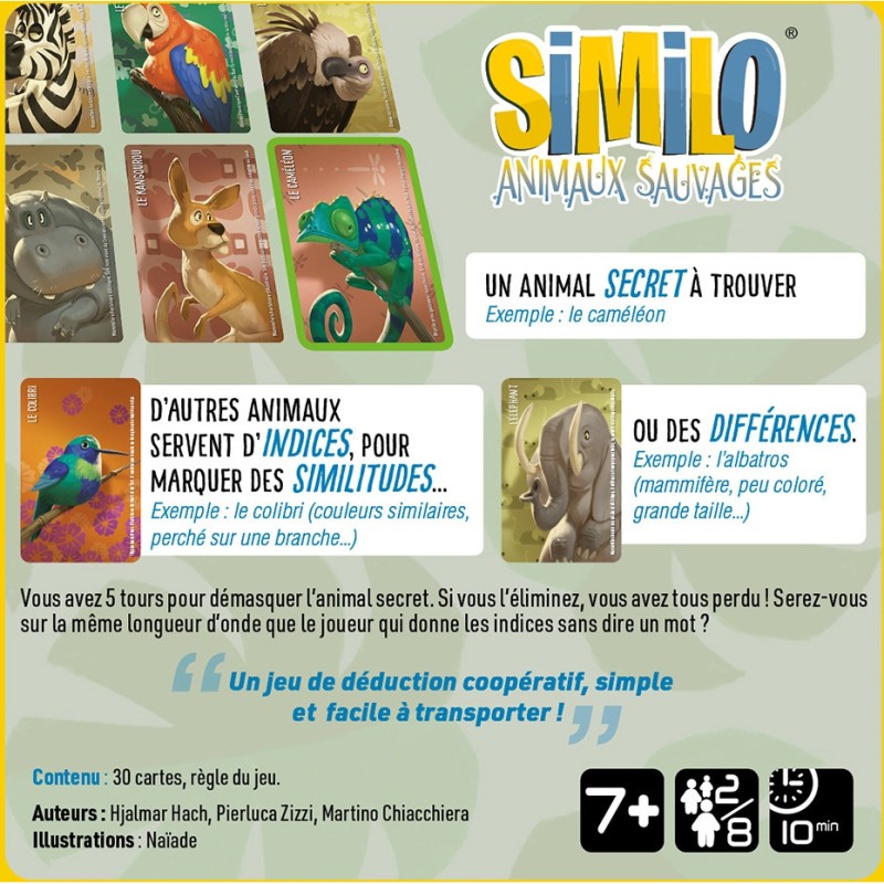 Similo Animaux sauvages est un jeu de déduction coopératif dans lequel les joueurs doivent retrouver l'animal secret du narrateur à l'aide d'autres animaux. Similitudes, différences, à vous de deviner ce que le narrateur essaye de vous indiquer. Est-ce un animal à écailles ? Un prédateur ? Un animal qui vient du même endroit ? A-il le pelage de la même teinte ? Autant de questions auxquelles vous devrez trouver réponse.