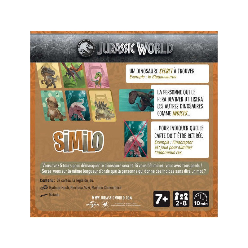 Cet opus rempli de dinosaures du jeu de déduction Similo, acclamé par la critique, est accompagnée de plus de 30 cartes magnifiquement illustrées par Naïade, représentant le portrait et le nom des dinosaures de l'univers de Jurassic World.