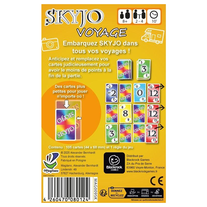 Embarquez Skyjo Voyage dans toutes vos aventures ! Cette version compacte du célèbre jeu Skyjo vous permet de jouer n’importe où, que ce soit dans les transports ou en vacances. Le but ? Cumuler le moins de points possible en échangeant, dévoilant et collectionnant habilement vos cartes. Mais attention, une fois qu’un joueur a retourné toutes ses cartes, la manche s’arrête !
