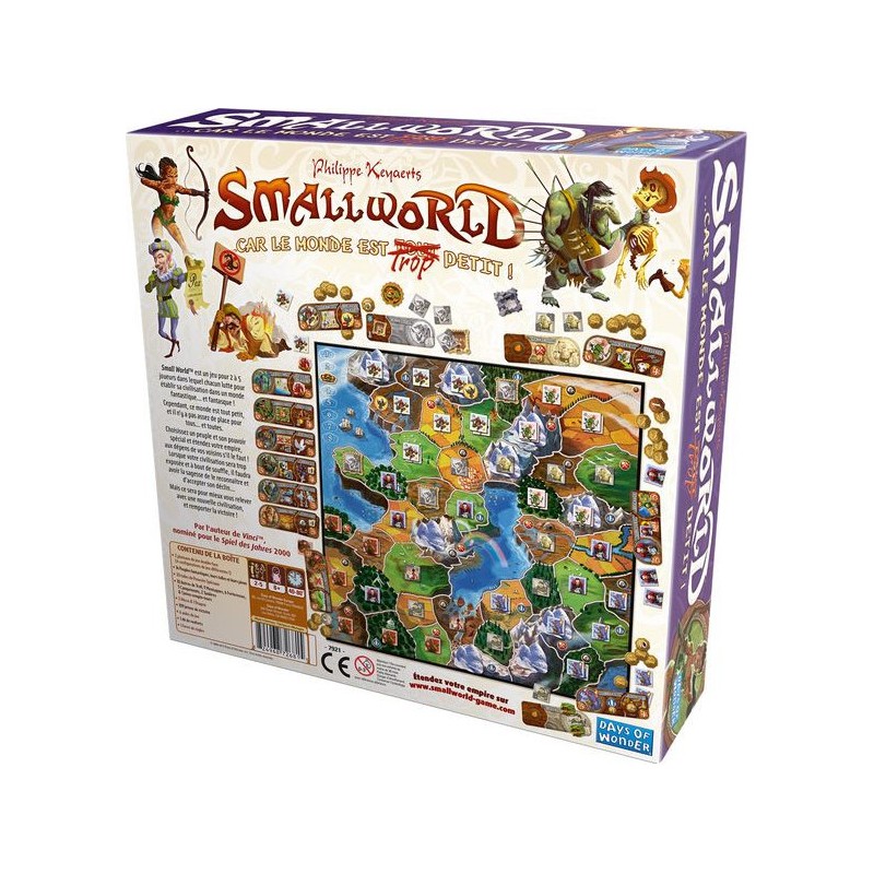 Small World est un jeu pour 2 à 5 joueurs dans lequel chacun lutte pour établir sa civilisation dans un monde fantastique et fantasque. Cependant, ce monde est tout petit, et il n'y a pas assez de place pour tous ! Prenez la tête d'un des quatorze Peuples de Small World et étendez votre empire aux dépens de vos voisins en vous appuyant sur les pouvoirs spéciaux de vos personnages ! Lorsque votre civilisation sera trop exposée, il faudra avoir la sagesse de le reconnaître et d'accepter son déclin... mais ce sera pour mieux vous relever avec une nouvelle civilisation et remporter la victoire ! Contenu