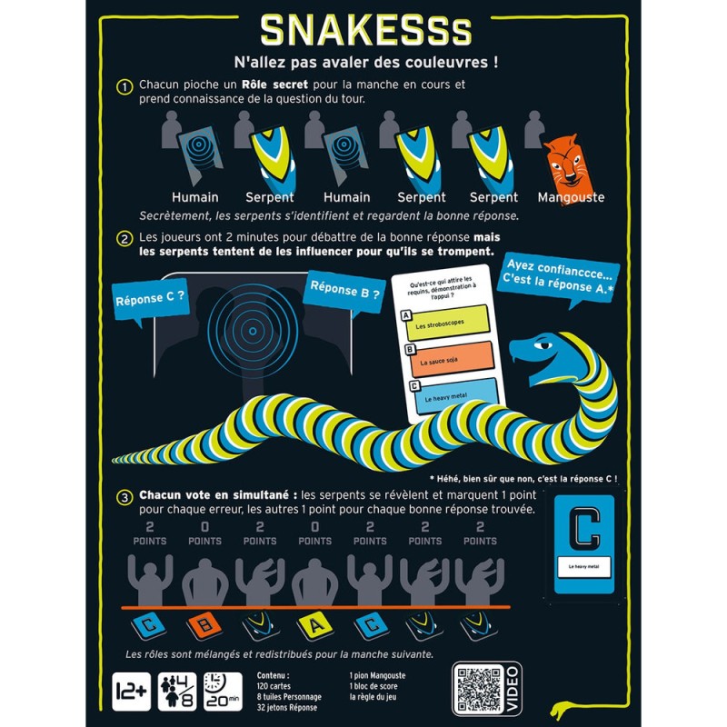 Chaque joueur se voit attribuer un rôle caché en début de tour: Serpent, Mangouste de la vérité ou Humain ordinaire. Et on pioche une carte Question. La mangouste révèle son identité, on peut lui faire confiance. 2 clans se forment alors: les Serpents qui se reconnaissent en début de tour et ont pour objectif d'influencer les autres joueurs vers une mauvaise réponse à la question. Et les humains Ordinaires et la mangouste, qui eux cherchent à trouver la bonne réponse. Il y a alors 2mn de discussions et chacun doit voter pour la réponse de son choix. Chaque Serpent marque 1 points par mauvaise réponse donnée et chaque humain reçoit 1 point par bonne réponse trouvée. Au tour suivant on redistribue les tokens Personnage et au bout de 6 manches, le joueur qui a le plus de points remporte la victoire!
