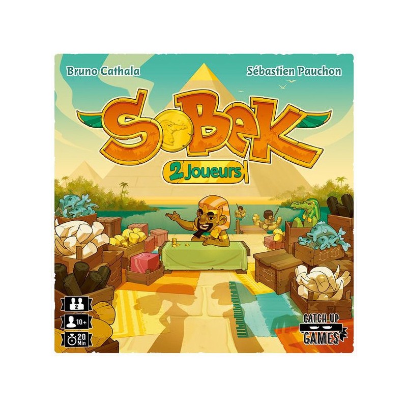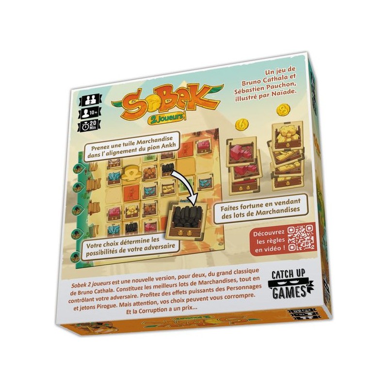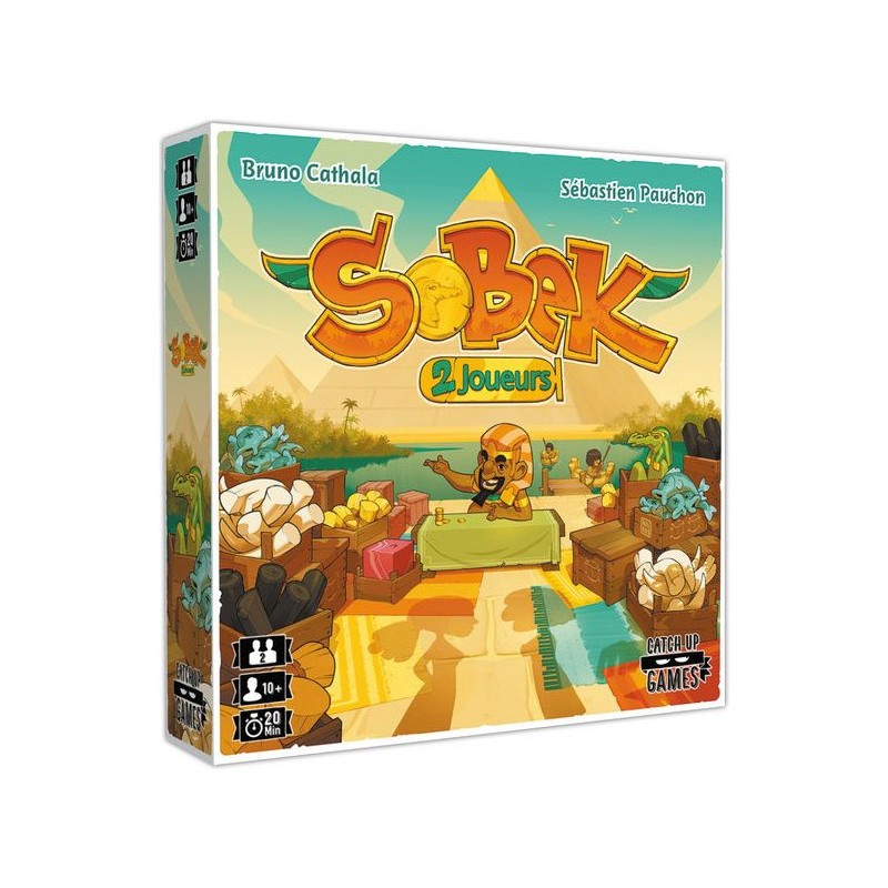 Dans Sobek 2 joueurs, deux adversaires collectent et vendent des Marchandises pour remporter le plus de Points de Victoire. Quand un joueur prend une Marchandise, il en sélectionne une dans l’alignement du pion Ankh et l’ajoute à sa main. Il place alors le pion Ankh dans l’alignement indiqué par la tuile qu’il vient de prendre, déterminant ainsi les choix de son adversaire. Quand il en a suffisamment, le joueur peut vendre un lot d’au moins 3 tuiles de même type. Ces tuiles lui rapporteront des Points de Victoire en fin de partie, en fonction de leur quantité et du nombre de Scarabées qu’elles présentent. Mais les joueurs peuvent également compter sur les puissants pouvoirs de Personnages pour renverser la tendance. Tout est ici question de tempo : analyser les possibilités de son adversaire pour jouer les meilleurs coups et remporter la partie !