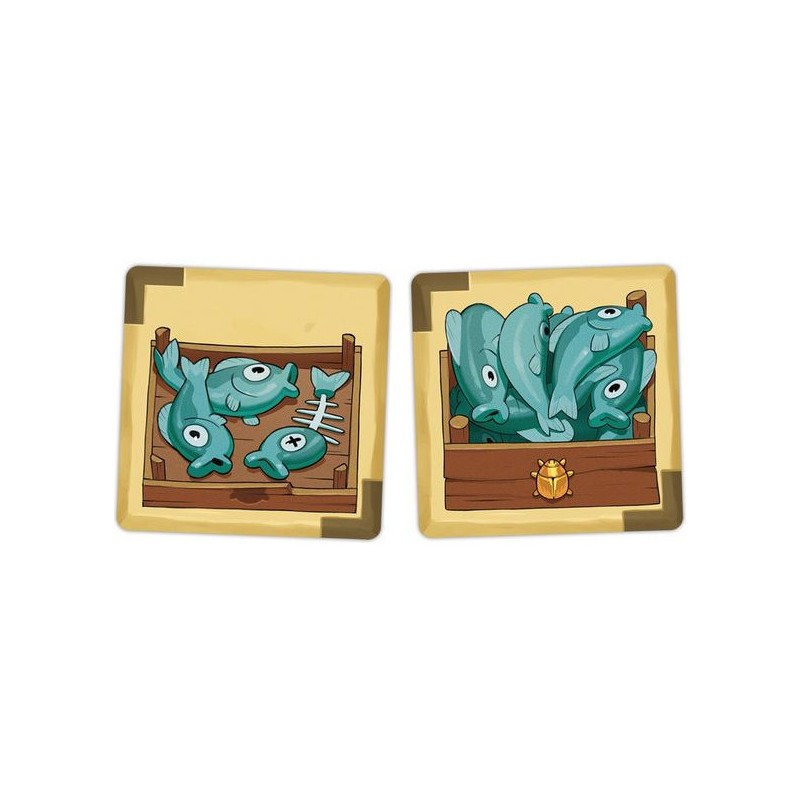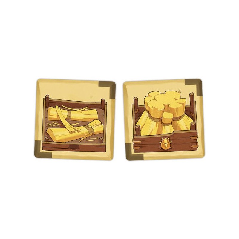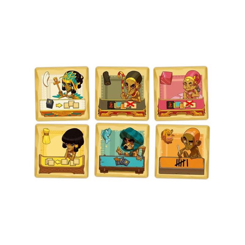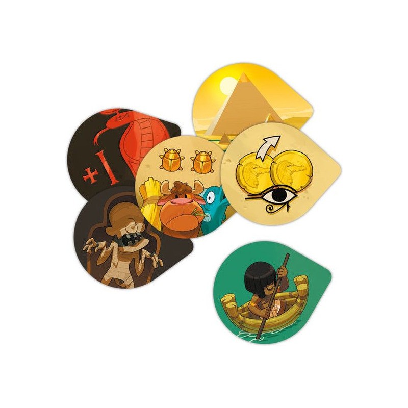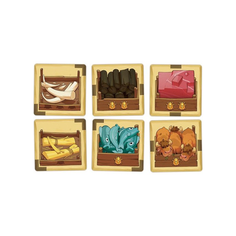 Contenu : 1 grand plateau Marché, 2 petits plateaux Corruption, 55 tuiles Marchandise, 10 tuiles Personnage, 13 jetons Pirogue, 13 jetons Deben, 1 sac, 1 pion Ankh, 2 grandes aides de jeu, 1 livret de règles