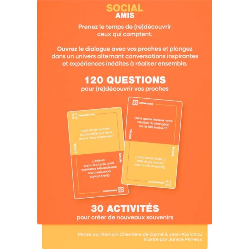 Piochez une carte et lisez la question à vos amis. Chacun répond à tour de rôle pour lancer la conversation. Piochez une nouvelle carte pour découvrir d’autres facettes de vos amis. Ensuite, retournez les cartes pour explorer des questions plus profondes et créer des échanges encore plus riches. Social contient également 30 activités à réaliser, conçues pour créer de nouveaux souvenirs et partager des moments uniques avec vos proches. Chaque partie devient ainsi une expérience conviviale, amusante et mémorable.