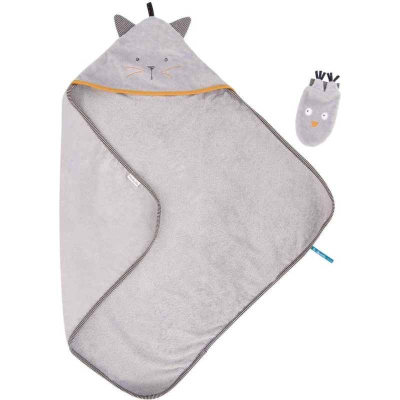 Pour envelopper bébé de douceur : gant petit hibou et sortie de bain tout en velours éponge gris avec capuche de lutin et petites oreilles de chat. Mais qui est ce tendre trio moustachu ? À la tombée de la nuit, les Moustaches jouent de la musique sur les toits, sous l’œil amusé de Monsieur Hibou, leur fidèle compagnon.
