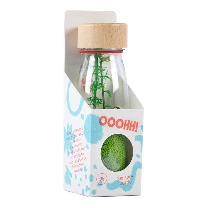 Fabriquée à la main en Espagne, à partir de plastique recyclable, d'un bouchon en bois d'érable et d'éléments naturels, la bouteille sensorielle Petit Boum est incassable. Elle est pensée et conçue pour les enfants dès 3 mois. L'intérieur est étanche et chaque bouteille dispose d'un double bouchon entièrement scellé pour que les petits puissent la manipuler en toute sécurité. Les flacons sensoriels Petit Boum sont exemptés de Bpa, de métal et de phtalates.