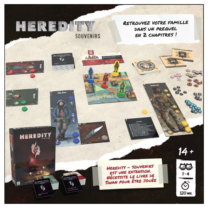 Heredity - Souvenirs est une extension pour Heredity. Retrouvez les 4 personnages de la campagne (Le Livre de Swan) dans un prequel en 2 chapitres. Des parties un peu plus courtes, des nouvelles mécaniques et plein d'autres surprises dans cette extension qui se déroule 10 ans plus tôt.