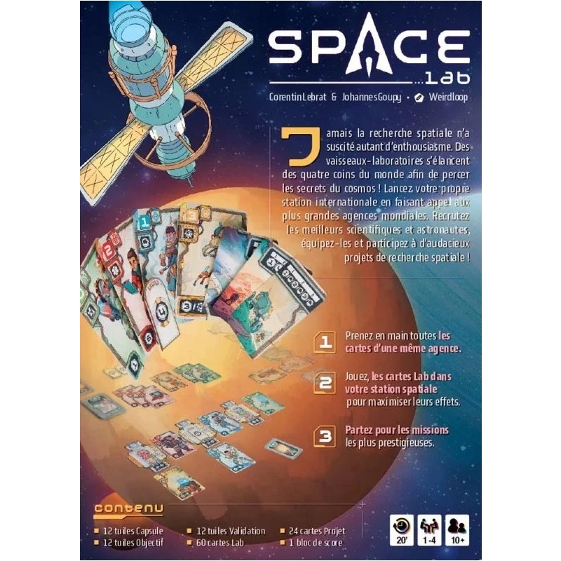 Space Lab plonge les joueurs au cœur d'une course scientifique interstellaire. À la tête d’une station spatiale modulaire, chaque joueur doit recruter les meilleurs spécialistes des quatre grandes agences mondiales pour mener à bien des projets ambitieux.