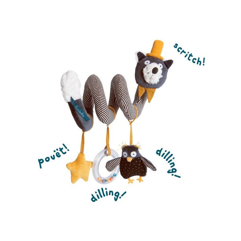 Spirale d'activités Alphonse le chat et son beau chapeau ! Il transporte avec lui un hibou hochet, un anneau à billes et une étoile pouët pour éveiller les sens de bébé. Un jouet à enrouler partout : dans son lit, dans sa poussette ou dans son cosy. Mais qui est ce tendre trio moustachu ? À la tombée de la nuit, les Moustaches jouent de la musique sur les toits, sous l’œil amusé de Monsieur Hibou, leur fidèle compagnon.