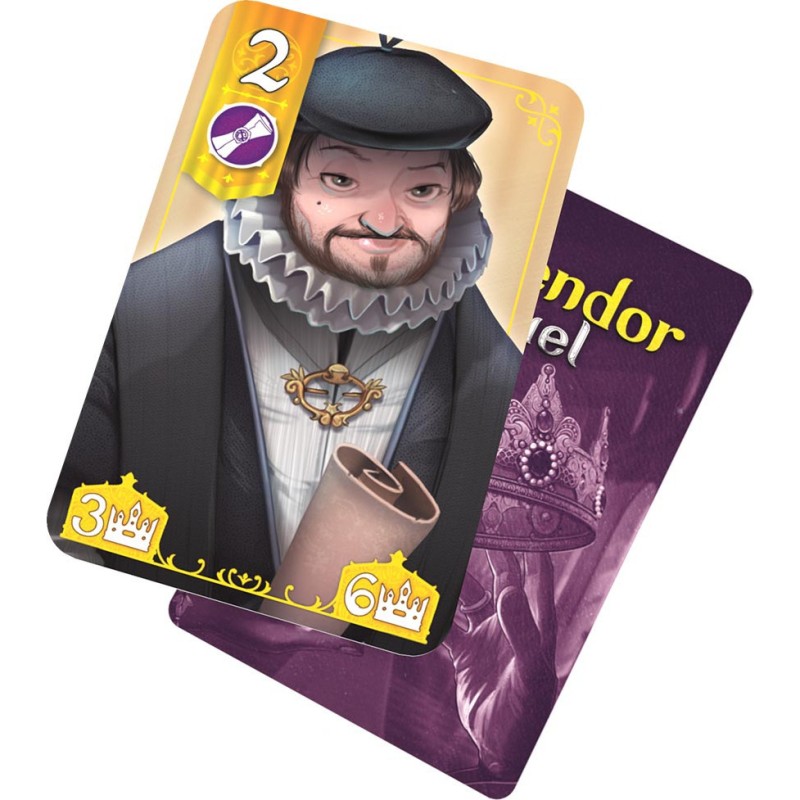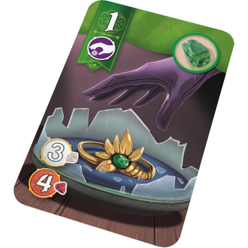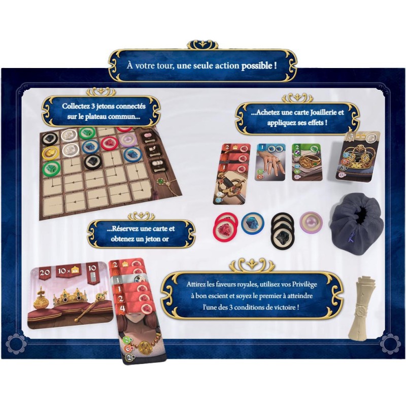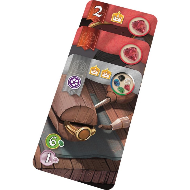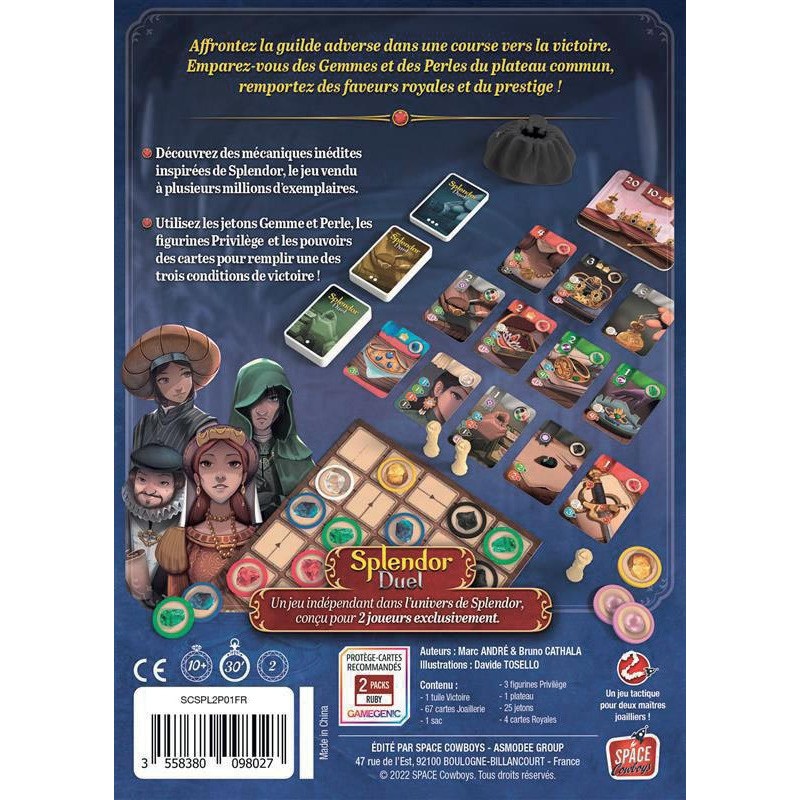 Affrontez la guilde adverse dans une course vers la victoire dans ce jeu situé dans l’univers du célèbre Splendor conçu spécialement pour être joué à deux. Emparez-vous de 3 Gemmes et Perles connectées du plateau commun, achetez des cartes joaillerie et appliquez ses effets, attirez les faveurs royales, utilisez vos Privilèges à bon escient et soyez le premier à atteindre l’une des 3 conditions de victoire ! Découvrez des mécaniques inédites et innovantes inspirées de Splendor, pour des parties fluides et simples, mais d’une grande richesse stratégique. Contenu