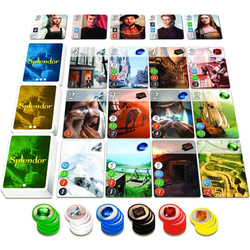 Un jeu tactique, rapide et addictif ! Splendor s’explique en cinq minutes et se joue en une demi-heure, aussi bien à deux qu’à trois ou quatre joueurs. Dans Splendor, vous dirigez une guilde de marchands. À l’aide de jetons symbolisant des pierres précieuses, vous allez acquérir des développements qui produisent de nouvelles pierres (les bonus). Ces bonus réduisent le coût de vos achats et attirent les nobles mécènes. Chaque tour est rapide : une action et une seule ! Le premier joueur à parvenir à quinze points de prestige en cumulant nobles et développements déclenche la fin de la partie. Contenu