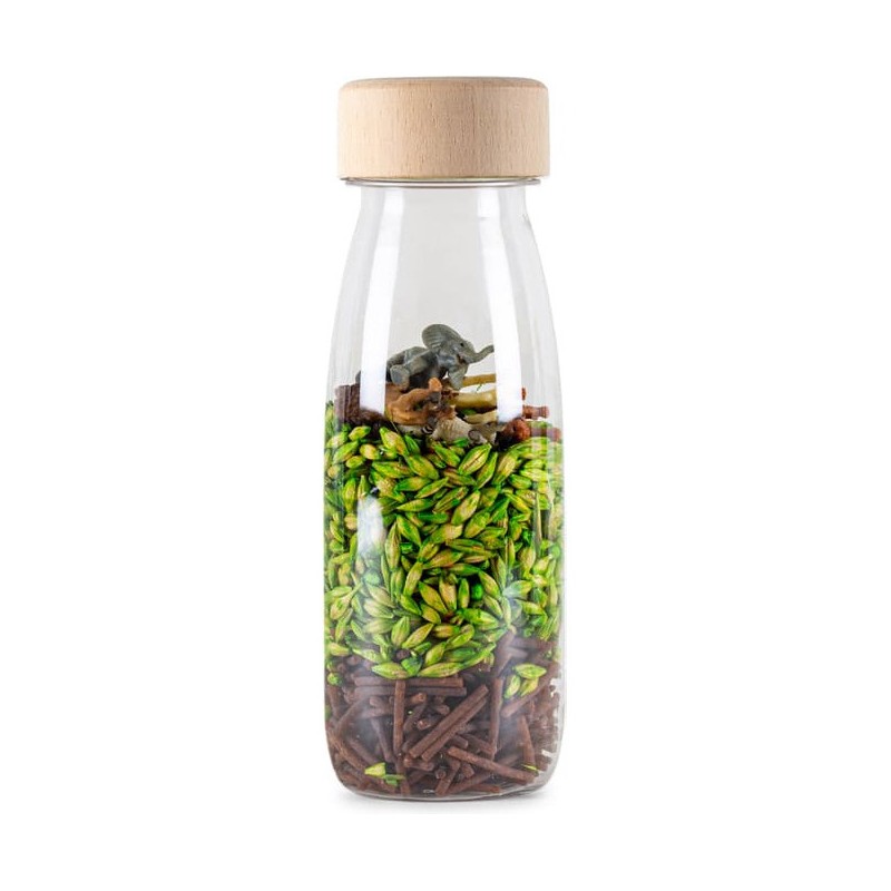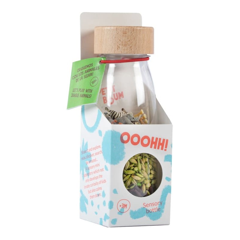 Découvrez la bouteille sensorielle Spy Jungle de la marque Petit Boum. Un jouet d’éveil coloré, inspiré de la pédagogie Montessori, qui stimule les sens des bébés dès 3 mois. Une bouteille à secouer qui va stimuler le sens auditif de votre enfant, qui va aussi explorer chaque détail et se détendre en observant le contenu du flacon. Votre enfant va pouvoir rechercher et découvrir ce qui se trouve à l'intérieur de la bouteille, identifier et compter les animaux, les secouer pour les cacher... Une invitation à explorer, à éveiller les sens et la curiosité des plus petits. Un microcosme à portée de main, accompagné d'une petite brochure avec des idées d'activités pour les plus de 18 mois. Fabriquée à la main en Espagne, à partir de plastique recyclable, d'un bouchon en bois d'érable et d'éléments naturels, la bouteille sensorielle Petit Boum est incassable. Elle est pensée et conçue pour les enfants dès 3 mois. L'intérieur est étanche et chaque bouteille dispose d'un double bouchon entièrement scellé pour que les petits puissent la manipuler en toute sécurité. Les flacons sensoriels Petit Boum sont exemptés de Bpa, de métal et de phtalates. Dimensions de la bouteille sensorielle : 14 x 4 cm.