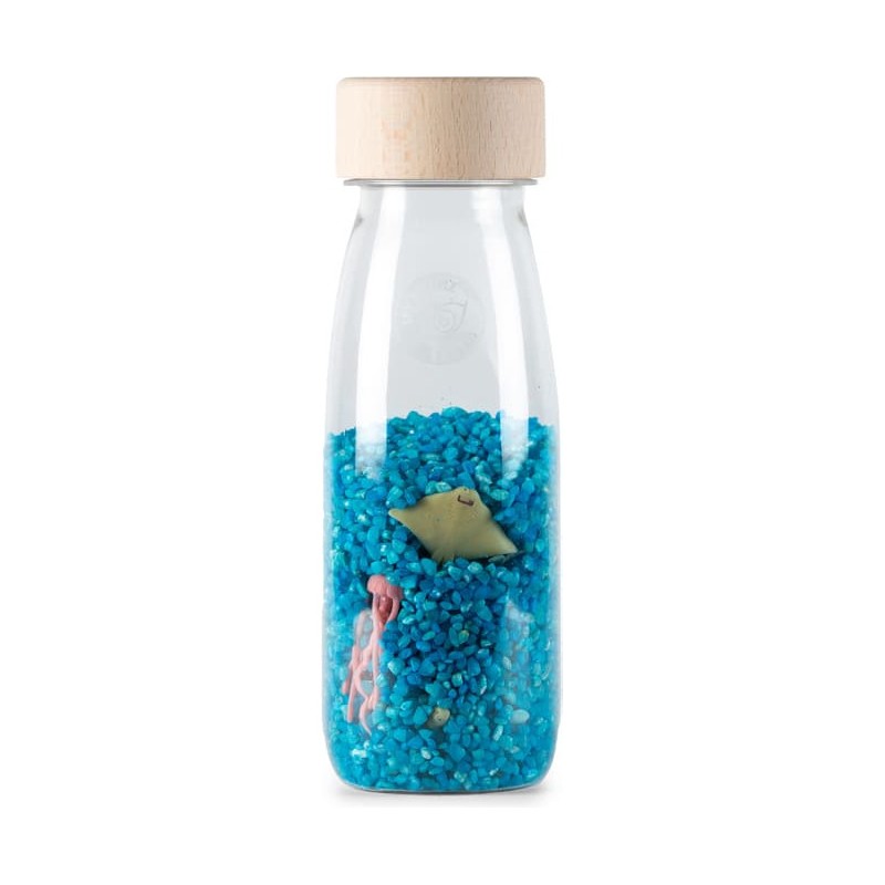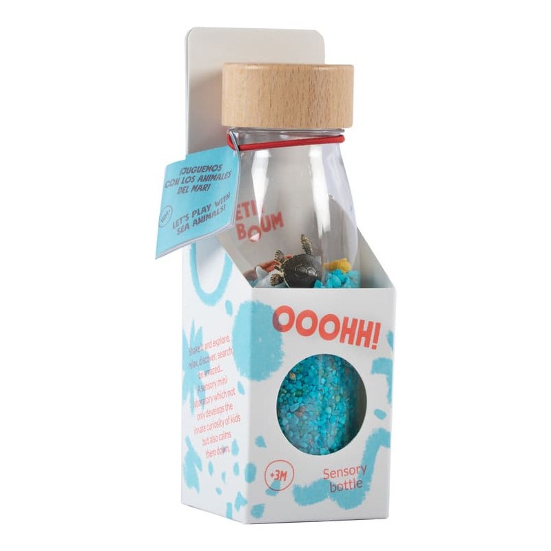 Découvrez la bouteille sensorielle Spy Mer de la marque Petit Boum. Un jouet d’éveil coloré, inspiré de la pédagogie Montessori, qui stimule les sens des bébés dès 3 mois. Une bouteille à secouer qui va stimuler le sens auditif de votre enfant, qui va aussi explorer chaque détail et se détendre en observant le contenu du flacon. Votre enfant va pouvoir rechercher et découvrir ce qui se trouve à l'intérieur de la bouteille, identifier et compter les animaux, les secouer pour les cacher... Une invitation à explorer, à éveiller les sens et la curiosité des plus petits. Un microcosme à portée de main, accompagné d'une petite brochure avec des idées d'activités pour les plus de 18 mois. Fabriquée à la main en Espagne, à partir de plastique recyclable, d'un bouchon en bois d'érable et d'éléments naturels, la bouteille sensorielle Petit Boum est incassable. Elle est pensée et conçue pour les enfants dès 3 mois. L'intérieur est étanche et chaque bouteille dispose d'un double bouchon entièrement scellé pour que les petits puissent la manipuler en toute sécurité. Les flacons sensoriels Petit Boum sont exemptés de Bpa, de métal et de phtalates. Dimensions de la bouteille sensorielle : 14 x 4 cm.