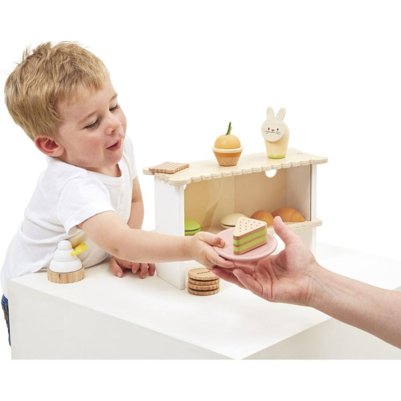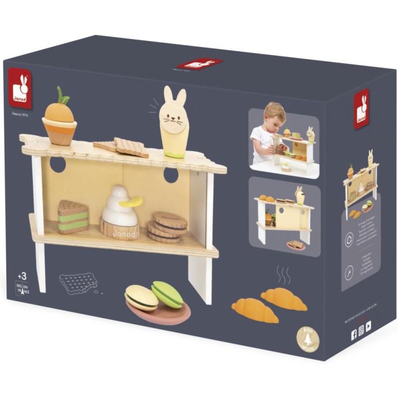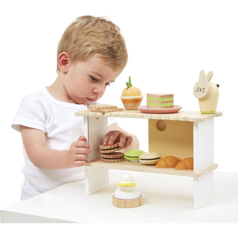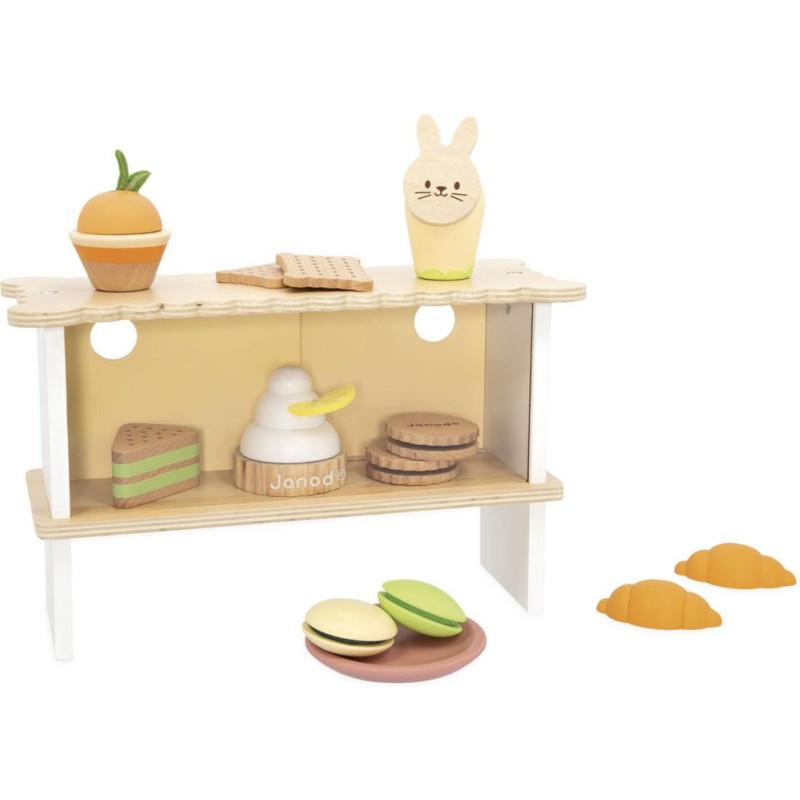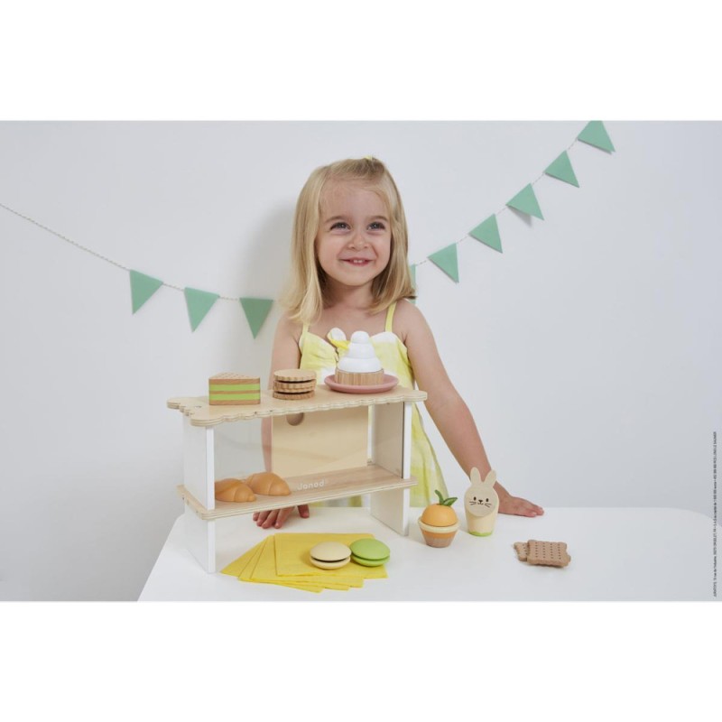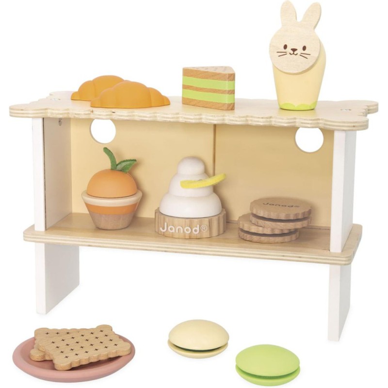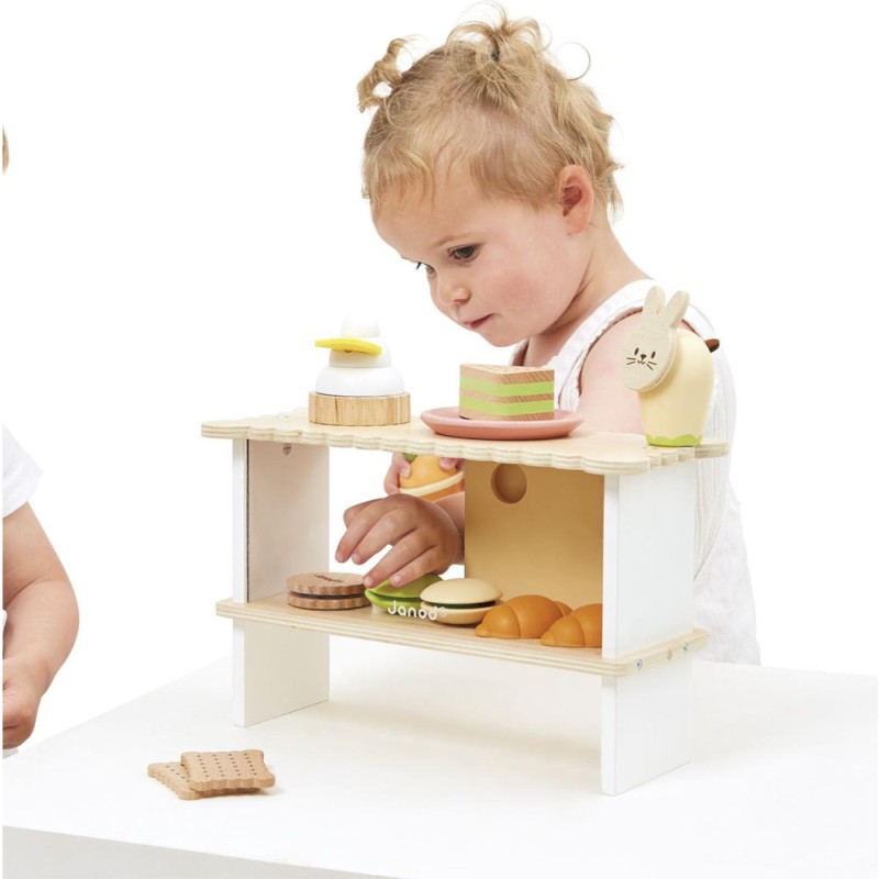 Vous prendrez bien du gâteau ? Ce stand de pâtisserie en bois vous propose viennoiseries, biscuits et autres douceurs à tout moment de la journée ! Les enfants à partir de 3 ans jouent à la marchande et imitent les plus grands au marché ou à la boulangerie. Au total, ce sont 12 desserts gourmands qui sont proposés : 2 biscuits fourrés au chocolat, 2 biscuits au beurre, 2 adorables macarons, 2 croissants gourmands, 1 beau gâteau à l'abricot, 1 délicieuse tarte au citron meringuée, 1 bon gâteau à la pistache, 1 joli gâteau en forme de lapin. Nos pâtissiers en herbe peuvent présenter leurs gâteaux et biscuits en bois dans la vitrine ou sur l'assiette de présentation, ça donne envie ! Pour servir doudou ou toute la famille, on ouvre la porte coulissante à l'arrière du stand et on attrape la gourmandise de son choix. Cette petite marchande se pose facilement sur une table et favorise ainsi des moments de partage à plusieurs : il y en aura pour tout le monde ! Ce jouet d'imitation sucré à souhait stimule aussi l'imagination des petits : et si le gâteau à la pistache était finalement à la courgette ? Livré avec tous ses accessoires, les douceurs de ce stand de pâtisserie se consomment sans modération !