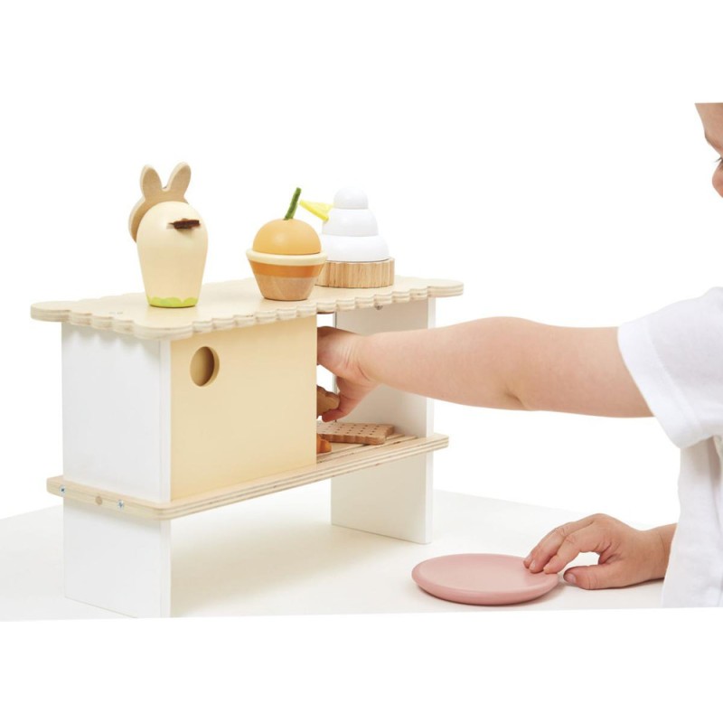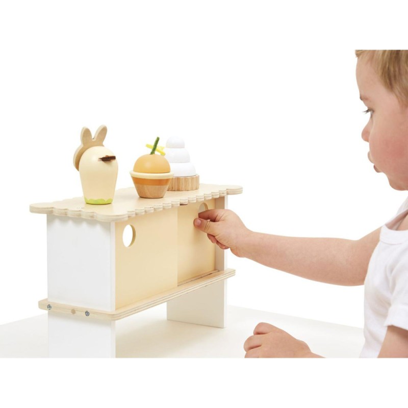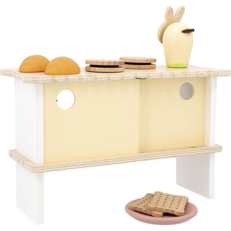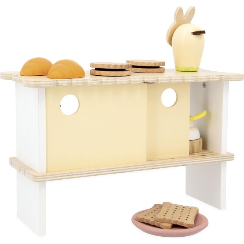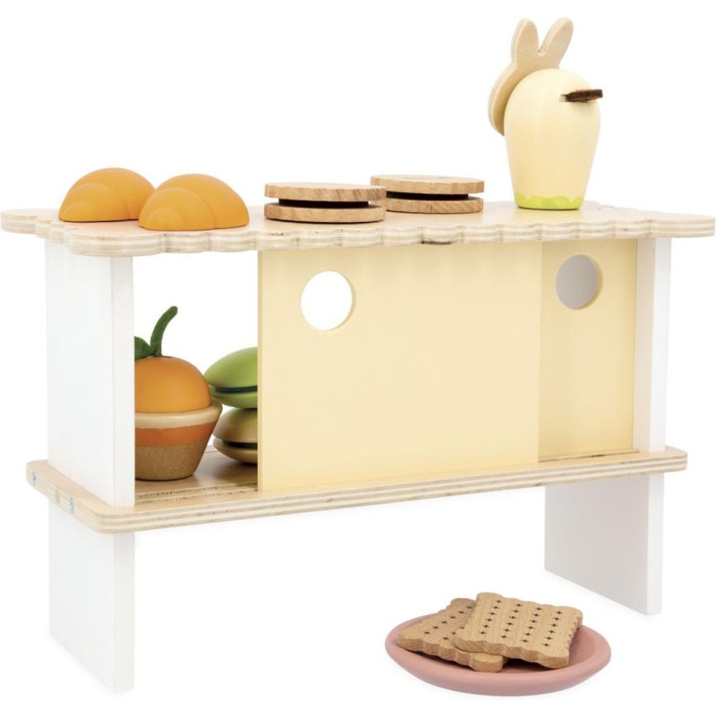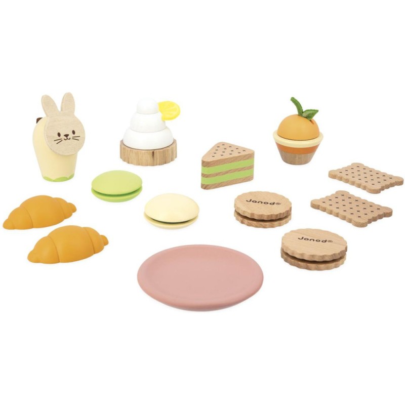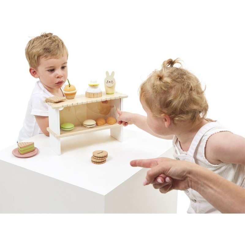 Vous prendrez bien du gâteau ? Ce stand de pâtisserie en bois vous propose viennoiseries, biscuits et autres douceurs à tout moment de la journée ! Les enfants à partir de 3 ans jouent à la marchande et imitent les plus grands au marché ou à la boulangerie. Au total, ce sont 12 desserts gourmands qui sont proposés : 2 biscuits fourrés au chocolat, 2 biscuits au beurre, 2 adorables macarons, 2 croissants gourmands, 1 beau gâteau à l'abricot, 1 délicieuse tarte au citron meringuée, 1 bon gâteau à la pistache, 1 joli gâteau en forme de lapin. Nos pâtissiers en herbe peuvent présenter leurs gâteaux et biscuits en bois dans la vitrine ou sur l'assiette de présentation, ça donne envie ! Pour servir doudou ou toute la famille, on ouvre la porte coulissante à l'arrière du stand et on attrape la gourmandise de son choix. Cette petite marchande se pose facilement sur une table et favorise ainsi des moments de partage à plusieurs : il y en aura pour tout le monde ! Ce jouet d'imitation sucré à souhait stimule aussi l'imagination des petits : et si le gâteau à la pistache était finalement à la courgette ? Livré avec tous ses accessoires, les douceurs de ce stand de pâtisserie se consomment sans modération !