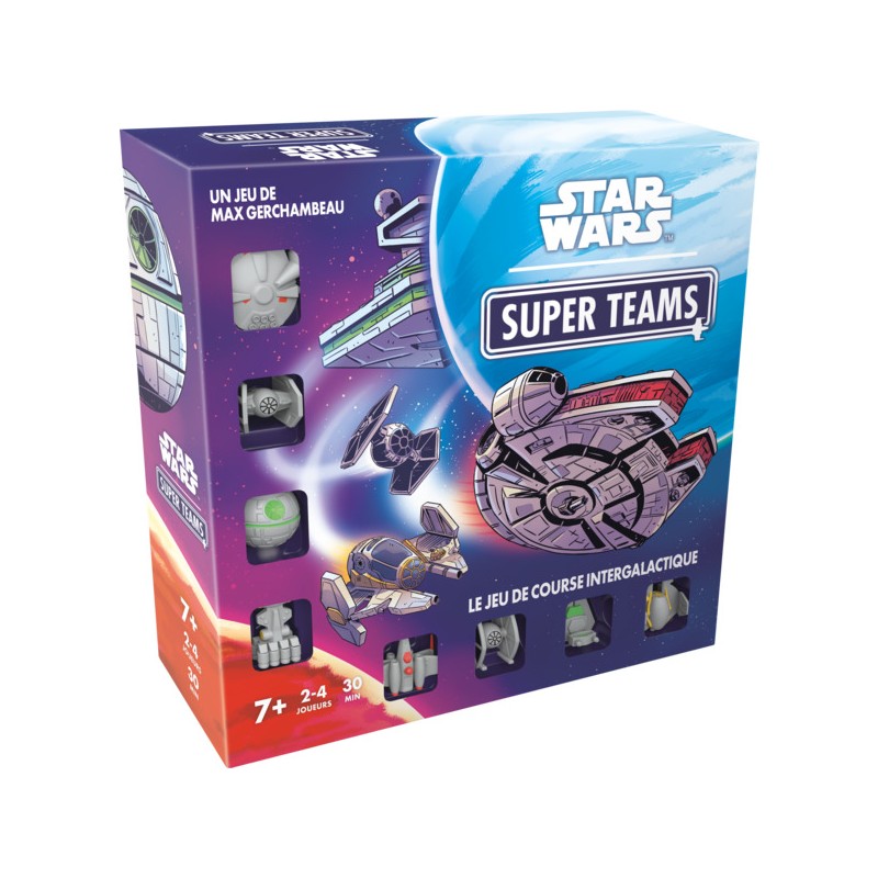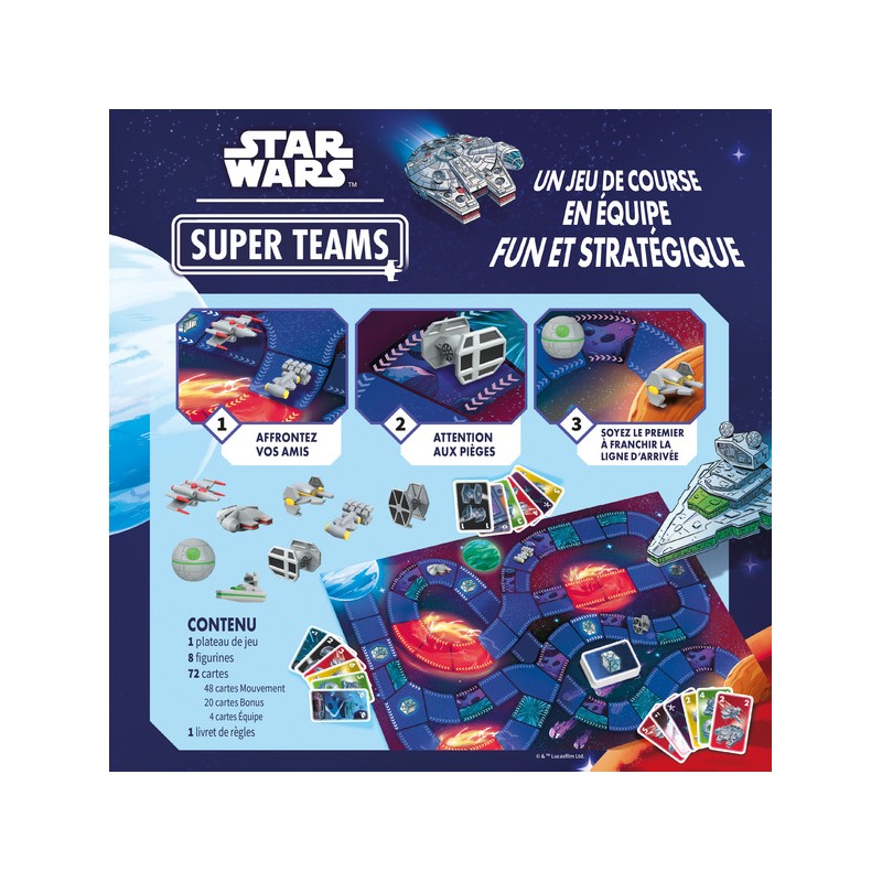 Dans Star Wars Super Teams, chaque joueur est au pilotage de deux vaisseaux emblématiques de la galaxie Star Wars™. Pour gagner, vos deux vaisseaux doivent avoir atteint la planète d’arrivée. Le but du jeu est d’être le premier à voir ses deux vaisseaux atteindre la planète d’arrivée. Pour cela, vous avez une main de 6 cartes Mouvement que vous devrez toutes jouer. Oui, mais il n’y a pas que les vôtres ! Les cartes de tous les joueurs sont mélangées puis distribuées aléatoirement. À vous de faire avancer un adversaire au bon moment pour l’envoyer sur les cases Gueules ou de faire bouger le vôtre pour lui donner un déplacement double sur une case Hyperespace ! Choisissez l’équipe que vous dirigerez, la rouge avec un X-Wing et le Faucon Millénium, la verte avec un Destroyer Stellaire et l’Etoile de la mort, la noire avec un Tie Fighter et un Advanced Tie Fighter, ou la jaune avec un Jedi Starfighter et un Tantine Iv ! Amenez ces vaisseaux emblématiques vers la victoire dans ce jeu familial et convivial. Contenu :