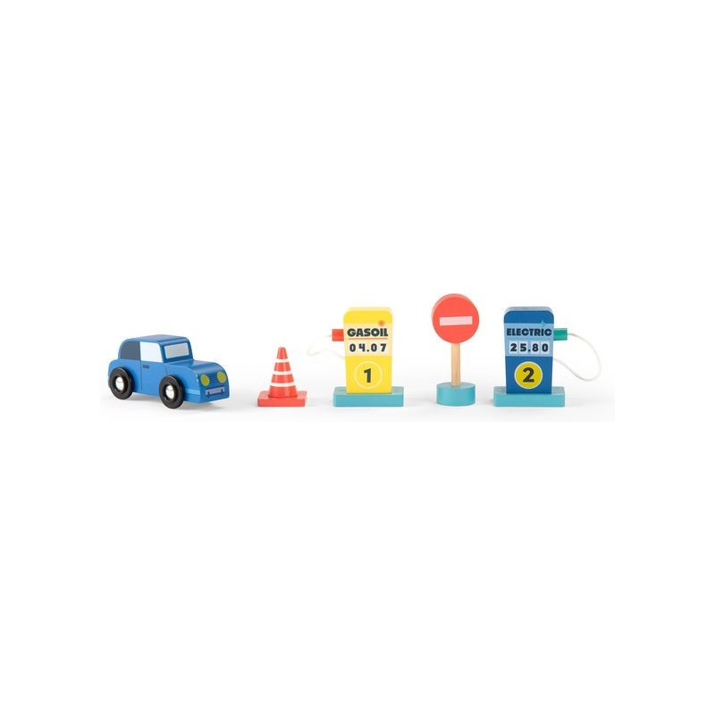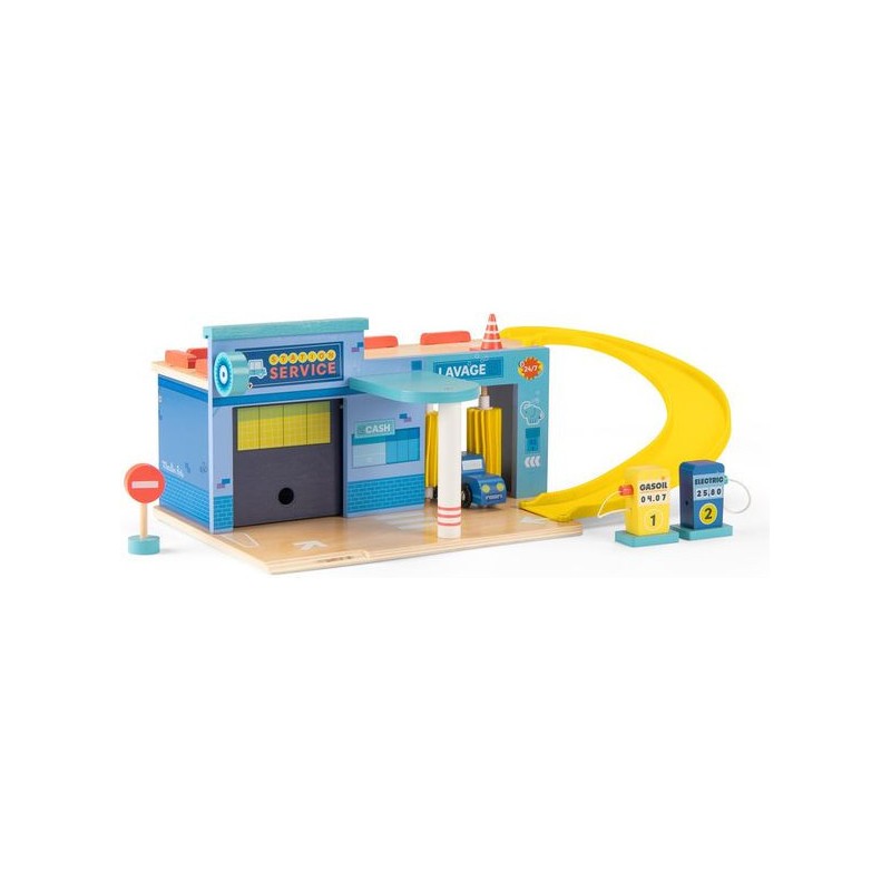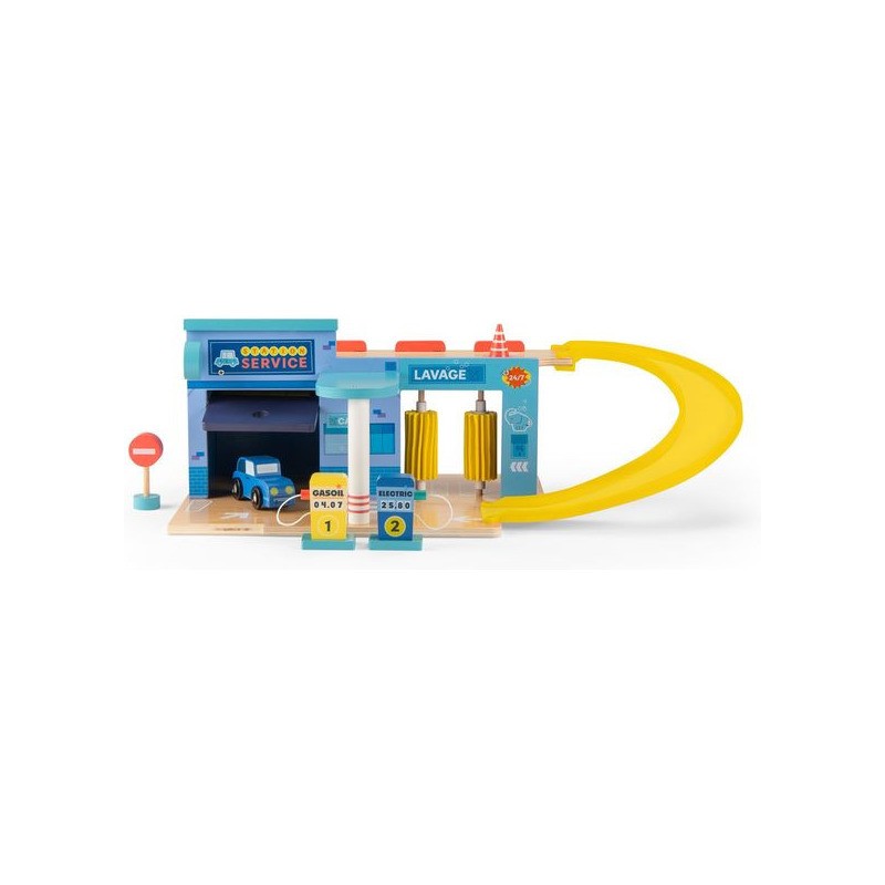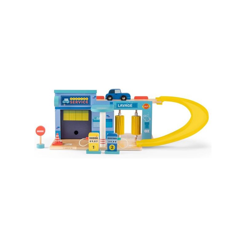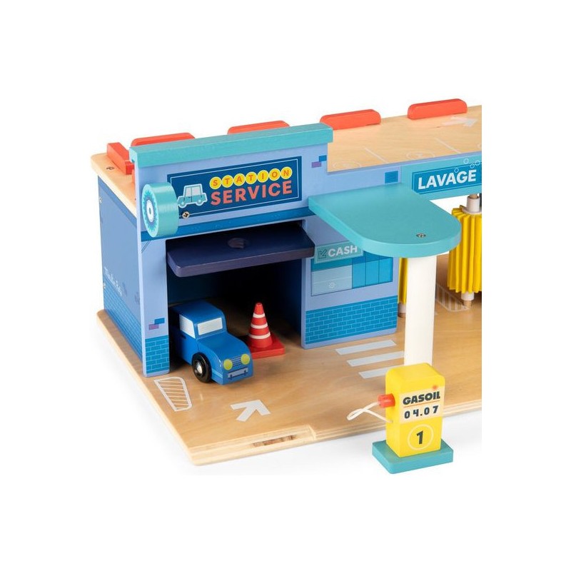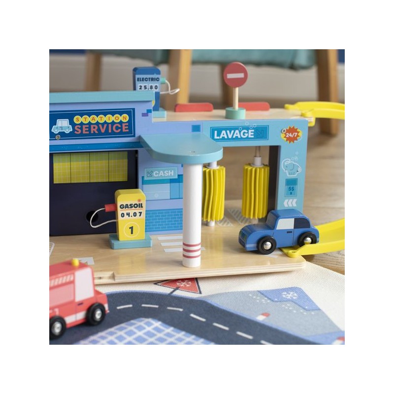 Station-service en bois avec 2 niveaux et accessoires pour faire fonctionner pleinement le lavage de voiture, la réparation automobile et la station d'essence/chargement. Remplir les réservoirs, laver les voitures, réparer les pannes : les petits peuvent inventer des histoires incroyables. Contenu : Station-service, 1 x rampe, 1 x voiture, 1 x panneau routier, 1 x cônes de signalisation, station d'essence/chargement.