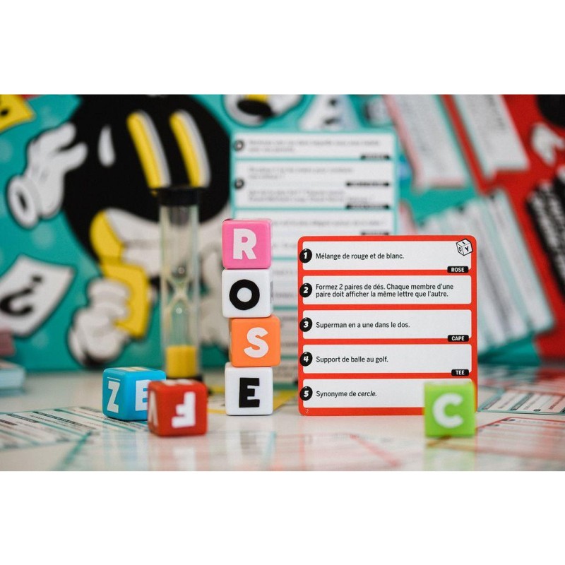 Contenu : 50 cartes Questions orales (1000 questions), 50 cartes Questions écrites (500 questions), 7 dés Lettres, 1 sablier (30 secondes), 1 carte Sablier
