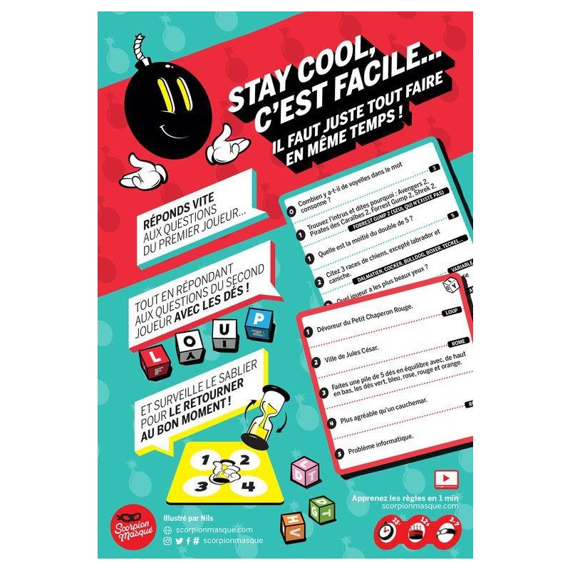 Le jeu multitâche Stay Cool c’est facile... Il faut juste tout faire en même temps ! Réponds vite aux questions du premier joueur... Tout en répondant aux questions du second joueur avec les dés. Et garde un oeil sur le sablier pour le retourner au bon moment !