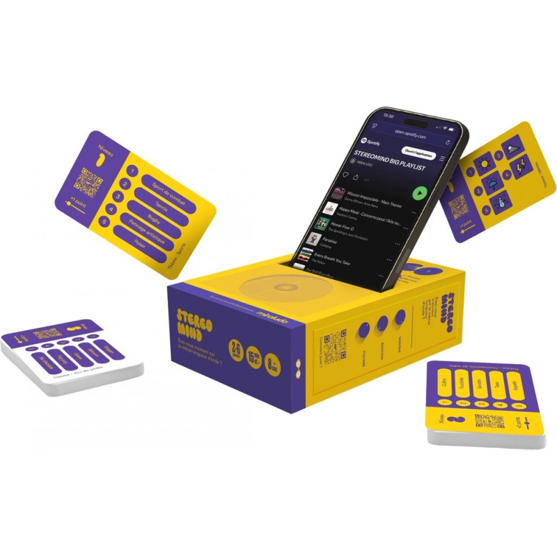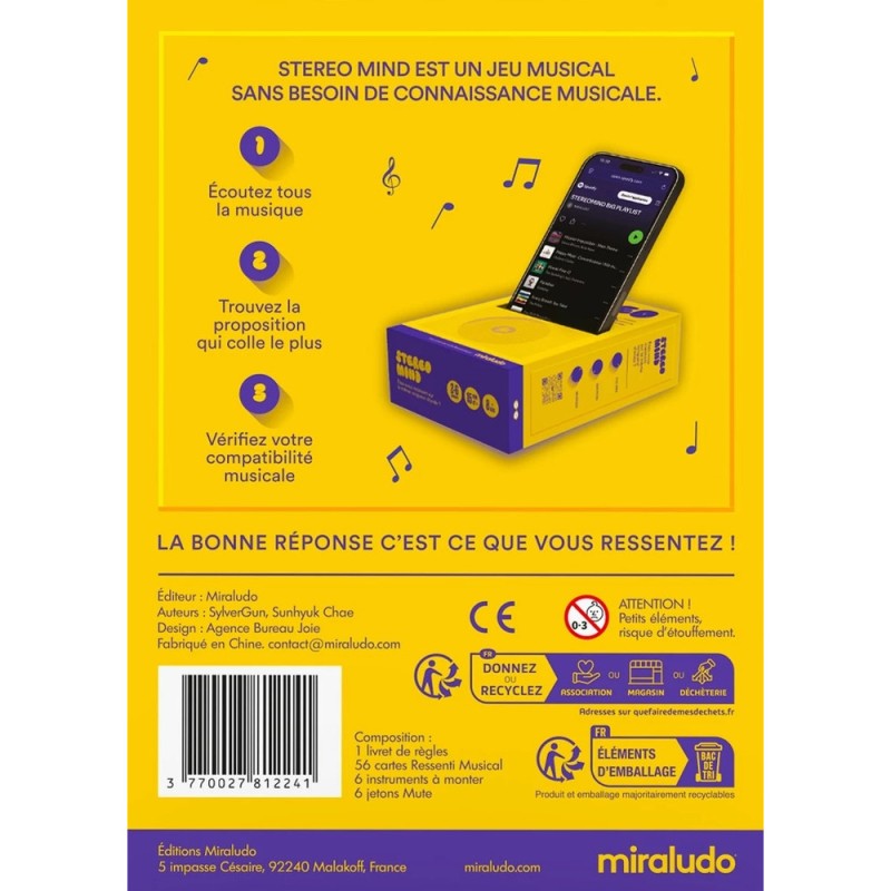 Stereo Mind est un jeu musical sans besoin de connaissance musicale. Le jeu se joue de 2 à 6 joueurs. Tout le monde écoute le même morceau de musique, puis chacun associe son ressenti à une proposition. Ce morceau vous fait penser à : "une ballade sous la pluie", "une sieste au soleil"... Quand chacun a fait son choix, on découvre les réponses.